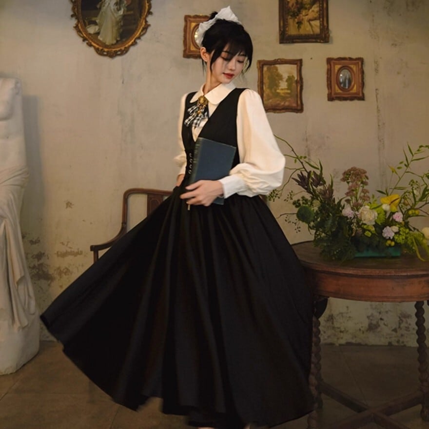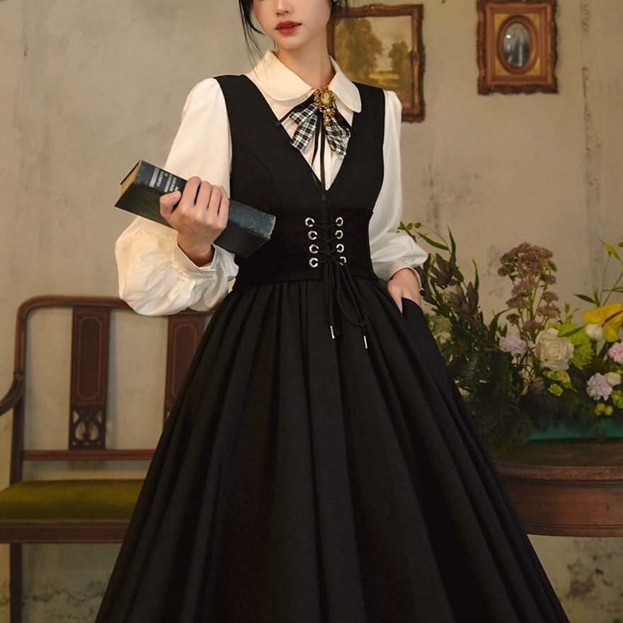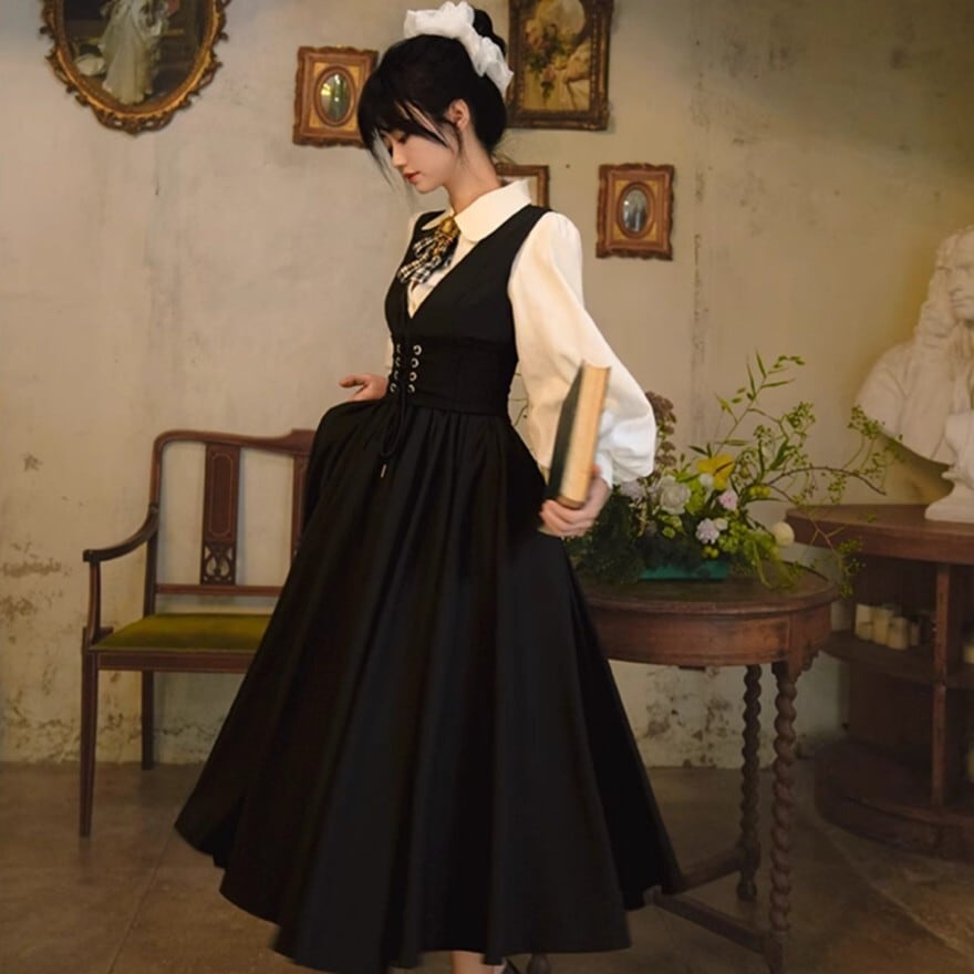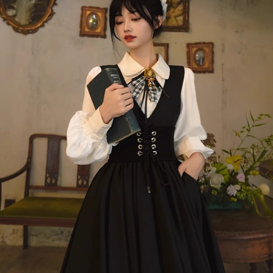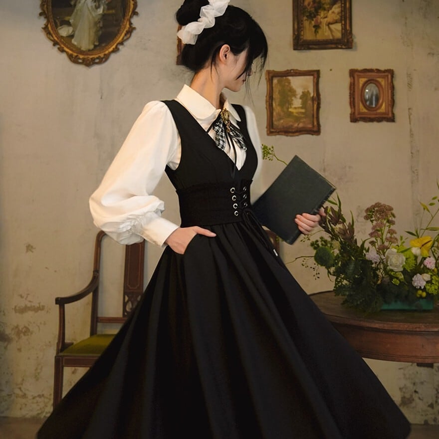 黒のジャンパースカートは重く見えそうと感じる方でも、胸元をすっきり見せるデザインのおかげで取り入れやすいバランスです。インナーのブラウス次第で雰囲気を変えやすく、手持ちアイテムとも合わせやすいのが魅力です。