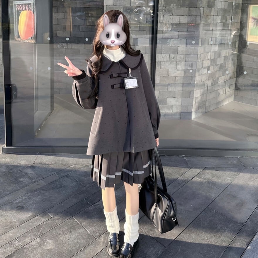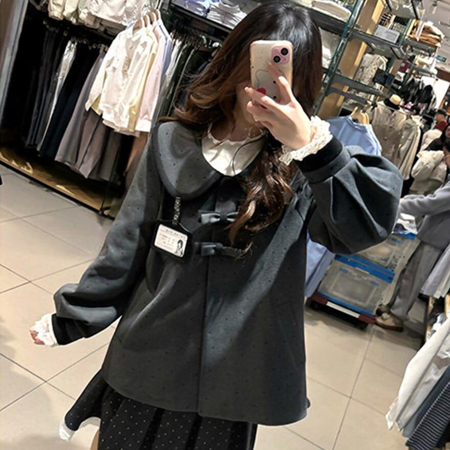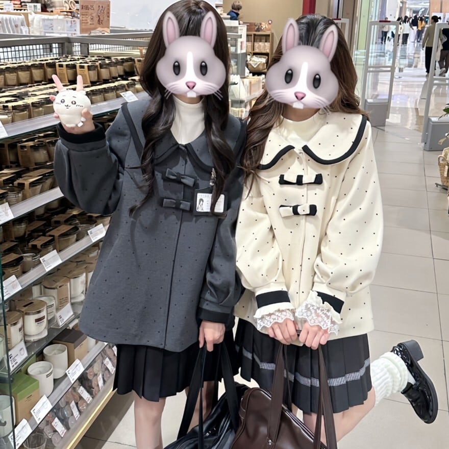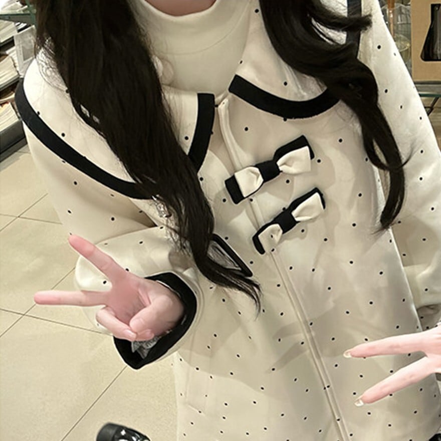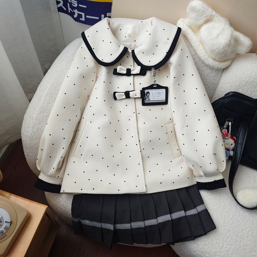 ドット柄のビッグカラーとフロントリボンが印象的なジャケットに、端正なプリーツスカートを合わせたデザインで、学院風のお出かけコーデや双子風のリンクスタイルに最適です。可憐さを残しながらも甘くなりすぎず、整ったシルエットで上品に着こなせます。