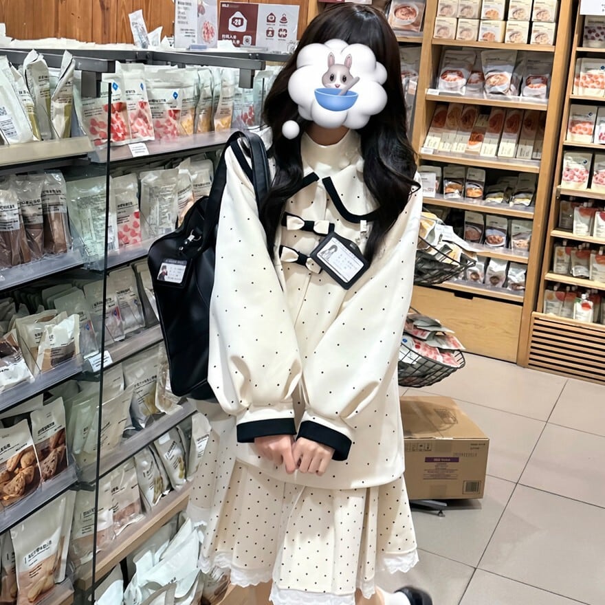 クラロリや制服風コーデに惹かれても、甘さが強すぎる装いは避けたい方に取り入れやすいセットアップです。ドット柄と配色ラインが全体を程よく引き締め、丸みのあるビッグカラーや袖口レースが可愛らしさを添えてくれます。上下でまとまりがあるため、ローファーやバッグを合わせるだけで世界観を整えやすいのも魅力です。