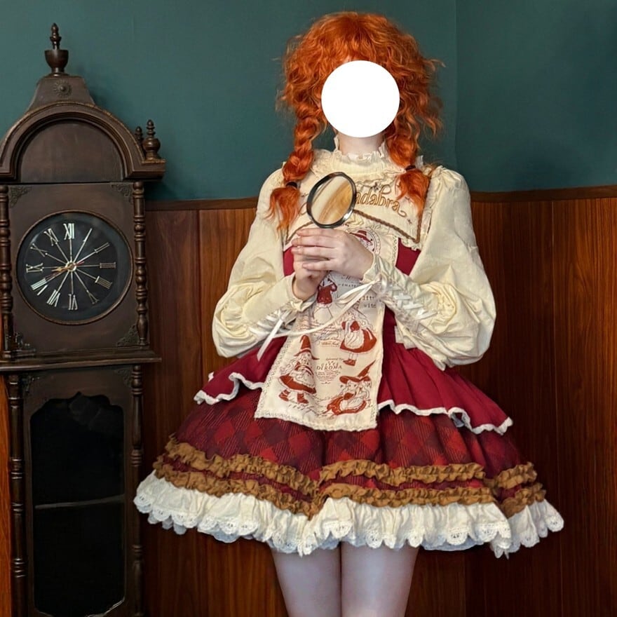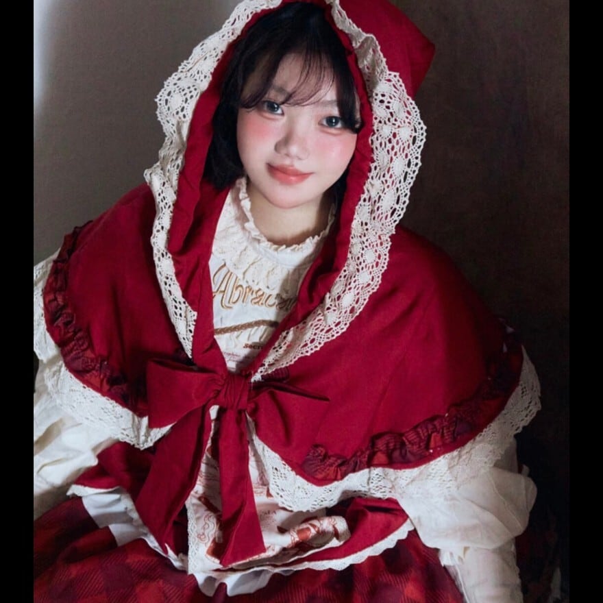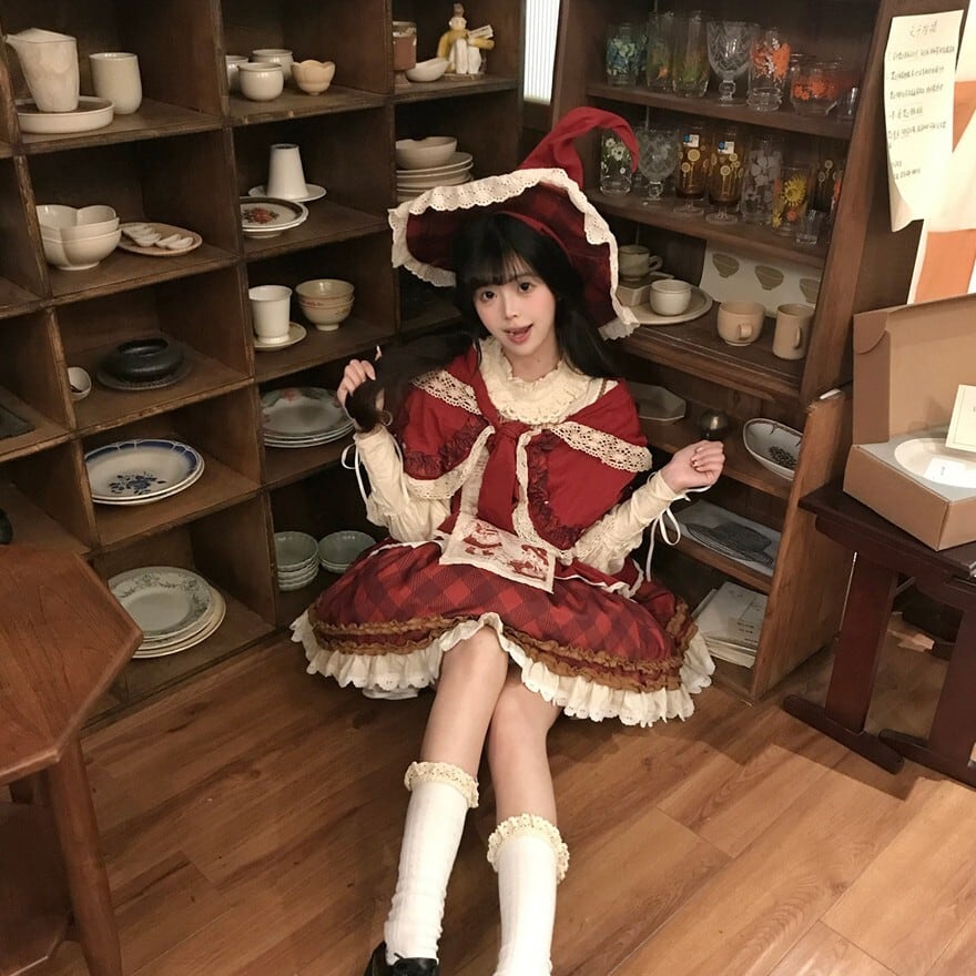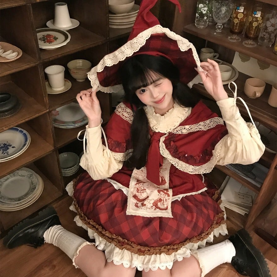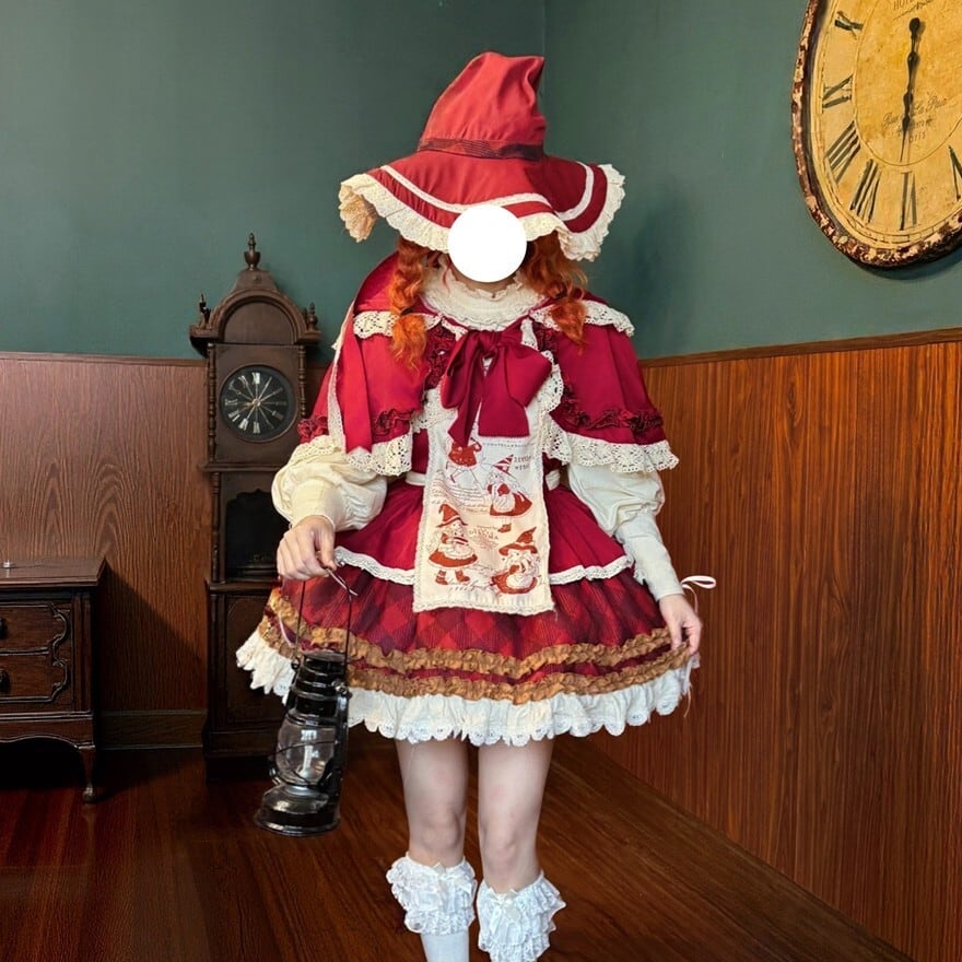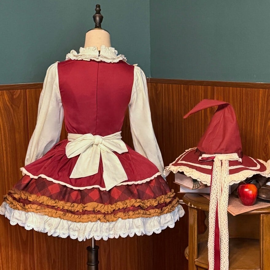 赤ずきん風のワンピースに物語性のある装飾と魔女帽子を合わせたデザインが特徴で、撮影会やイベント、世界観重視のコーデに最適です。深紅と生成りを基調に、チェック柄やレース、フリルを重ねることで、可憐さと退廃的な童話感を一着で完成させます。