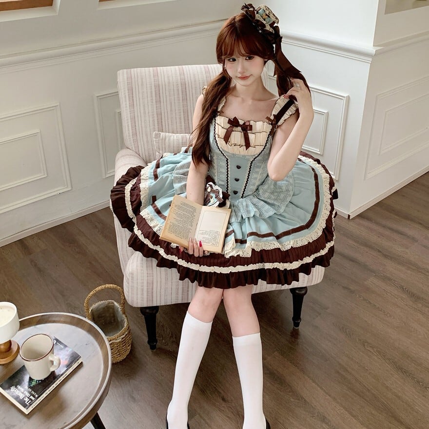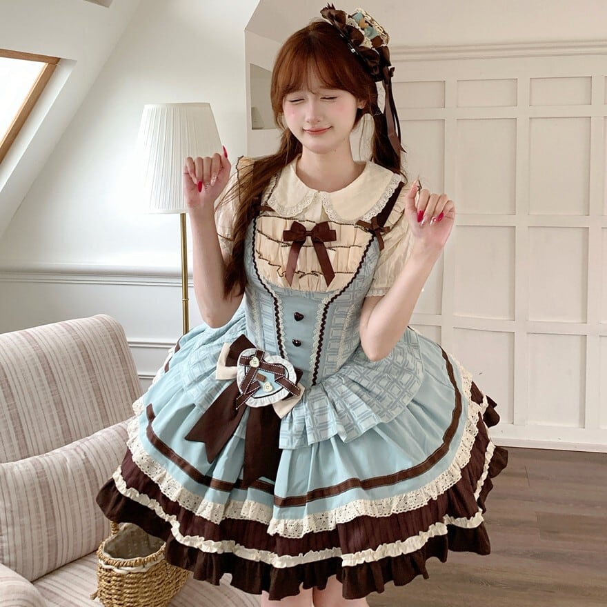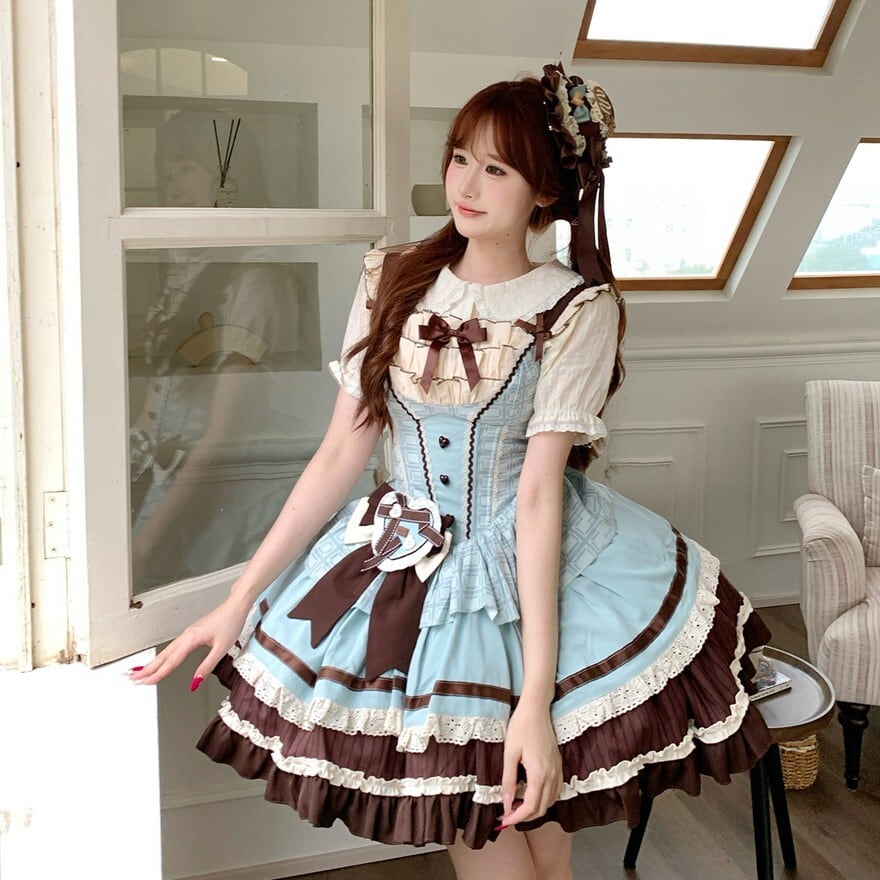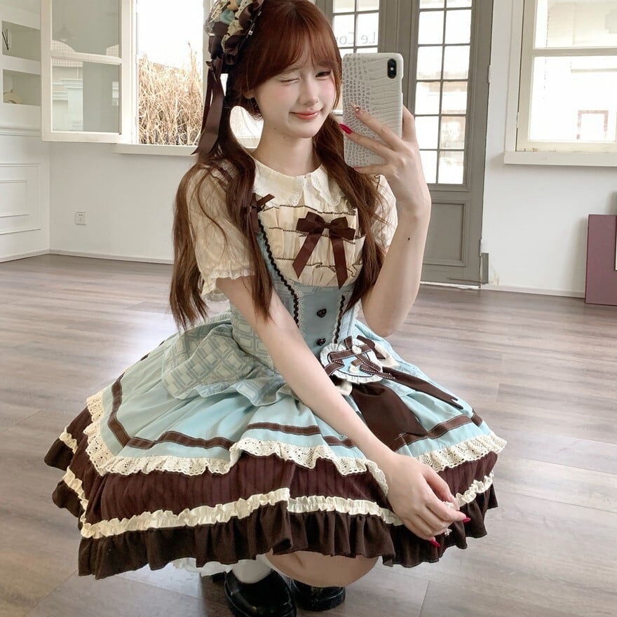 甘ロリらしい可愛さは好きでも、子どもっぽく見えすぎたり配色が単調になったりするのが気になる方に取り入れやすいジャンパースカートです。ミント系の軽やかさにブラウンの引き締め色を効かせることで、甘さをしっかり残しながら全体の印象を整えやすくなっています。フリルやリボンの装飾も豊かなので、ブラウスや小物を合わせるだけでコーデの完成度を高めやすいのも魅力です。