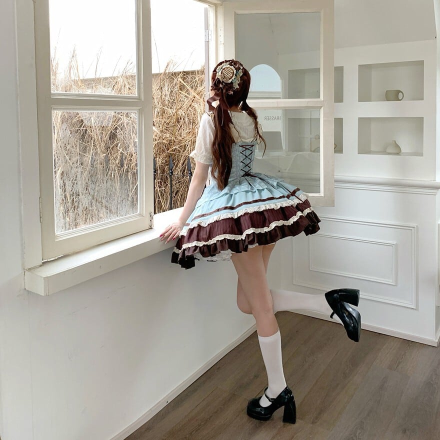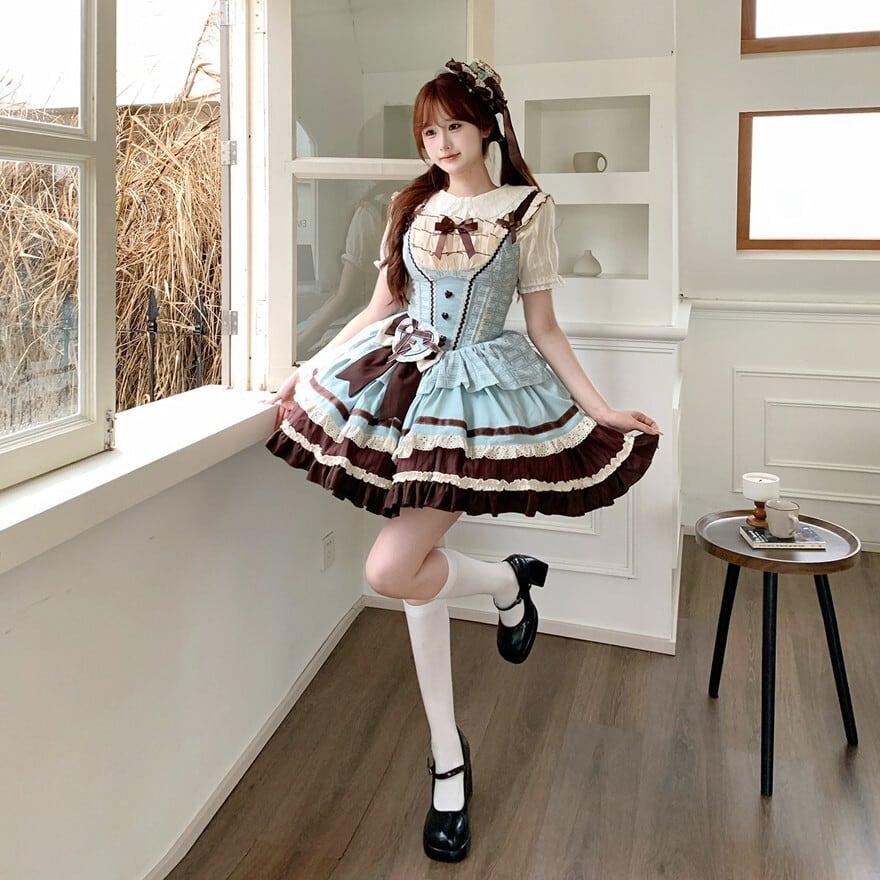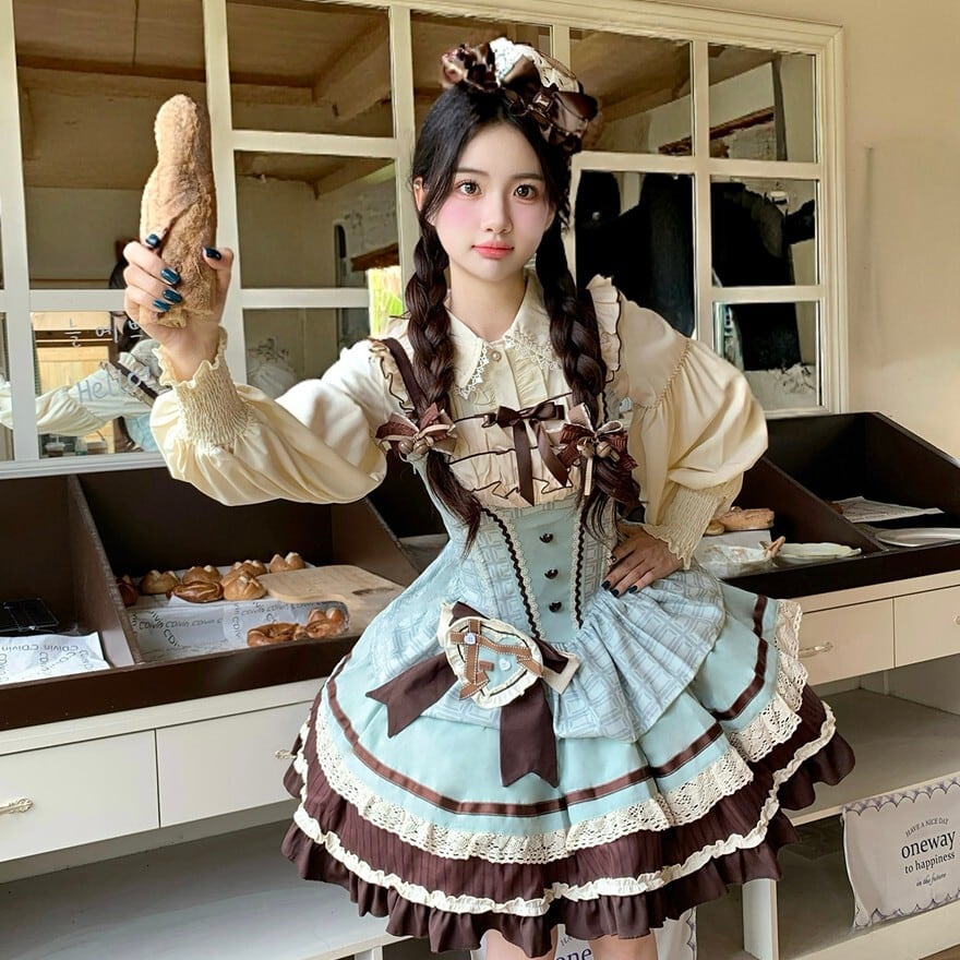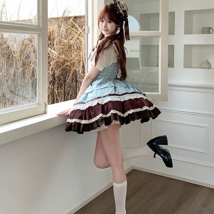 甘ロリらしい可愛さは好きでも、子どもっぽく見えすぎたり配色が単調になったりするのが気になる方に取り入れやすいジャンパースカートです。ミント系の軽やかさにブラウンの引き締め色を効かせることで、甘さをしっかり残しながら全体の印象を整えやすくなっています。フリルやリボンの装飾も豊かなので、ブラウスや小物を合わせるだけでコーデの完成度を高めやすいのも魅力です。