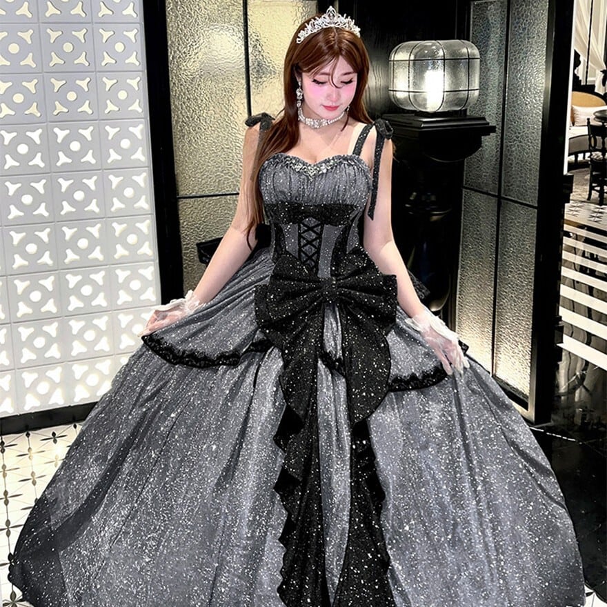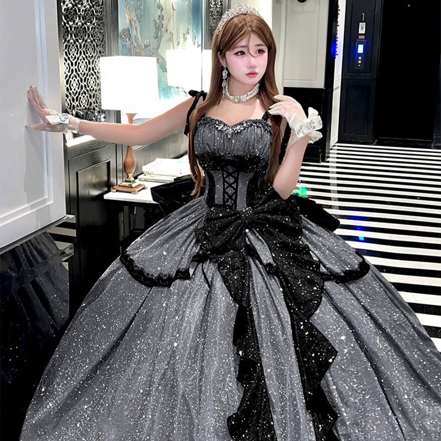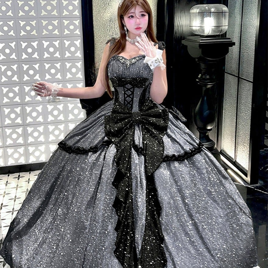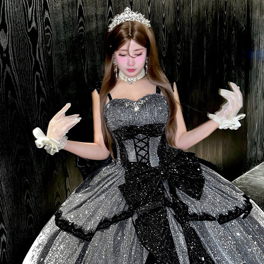 黒とシルバーのラメ感ある配色に大きなバックリボンを重ねたデザインが特徴で、パーティシーンや撮影会、特別なイベントに最適です。重厚な存在感がありながら、光を受けて揺れる華やかさが気品あるゴシックの印象を引き立てます。