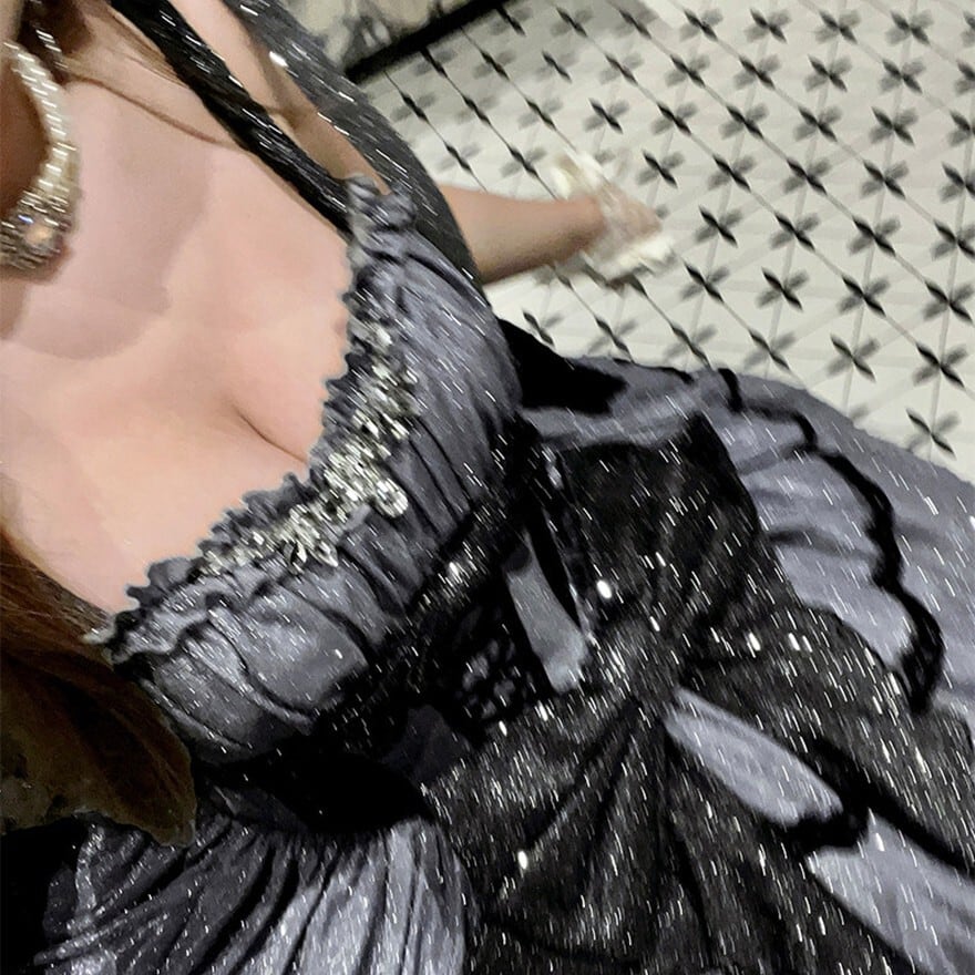 夜の静寂に銀の光を溶かし込んだような、格調高い一着です。漆黒の輪郭にきらめくスカートの揺れが重なることで、ただ華やかなだけでは終わらない、凛とした退廃美を纏わせます。
