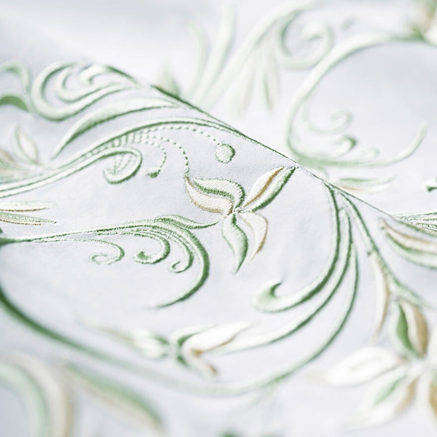 ・刺繍:胸元から裾にかけて植物調の繊細な刺繍をあしらい、クラシカルで上品な表情を作っています。