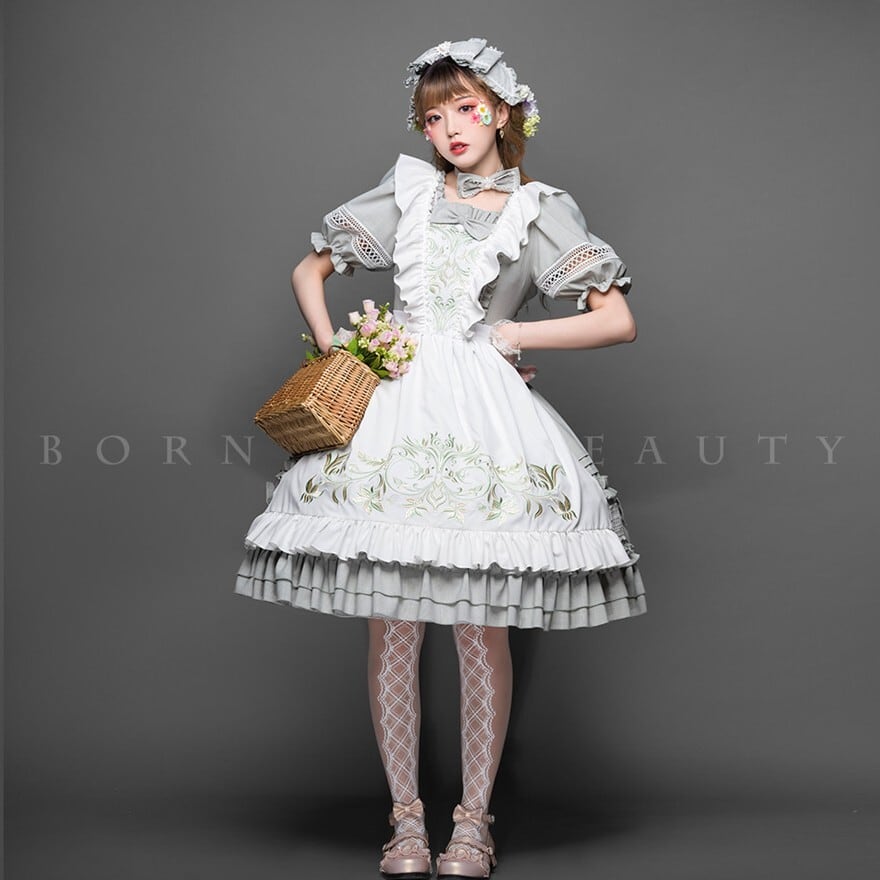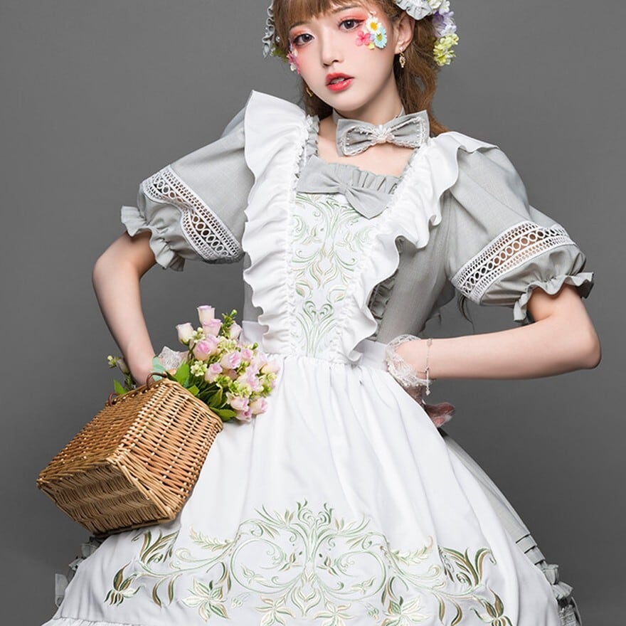 静かな洋館で時を重ねたメイド服のように、可憐さの中へ凛とした空気を宿した一着です。灰白のやわらかな重なりと繊細な刺繍が、愛らしさだけでは終わらない上品な余韻を残します。