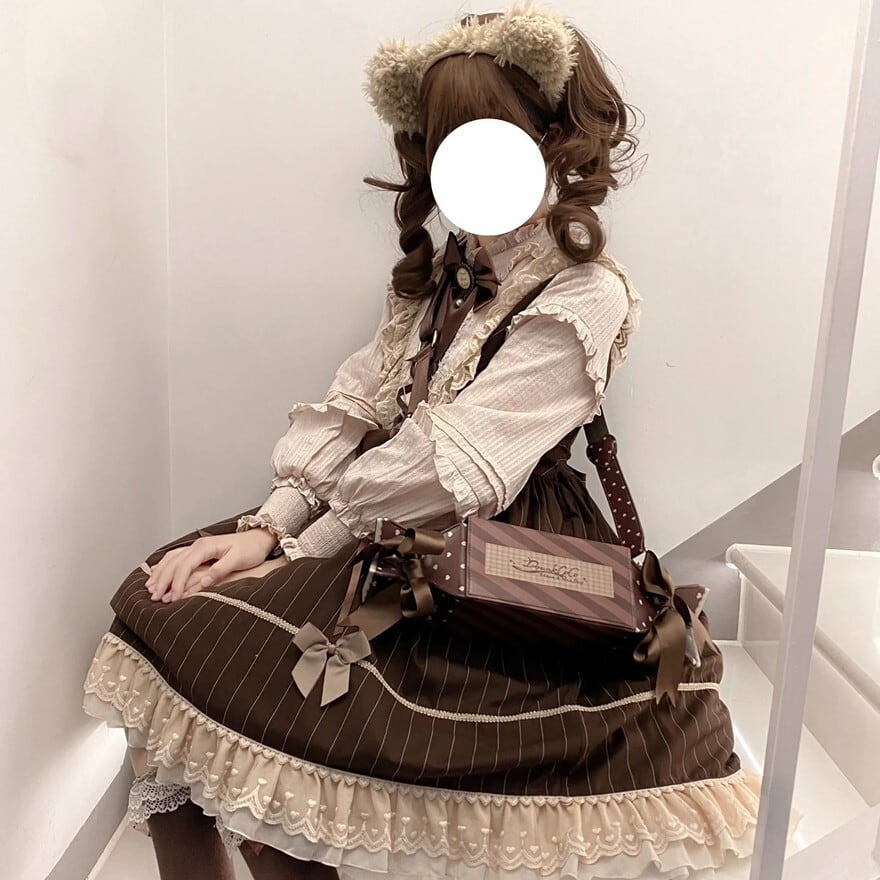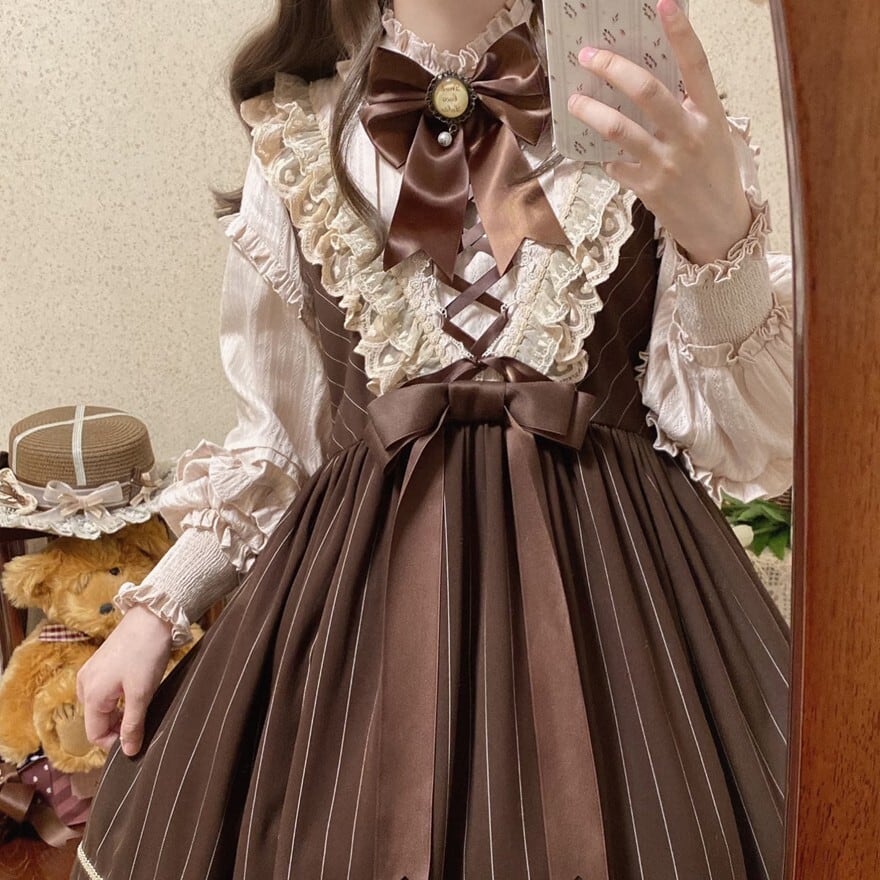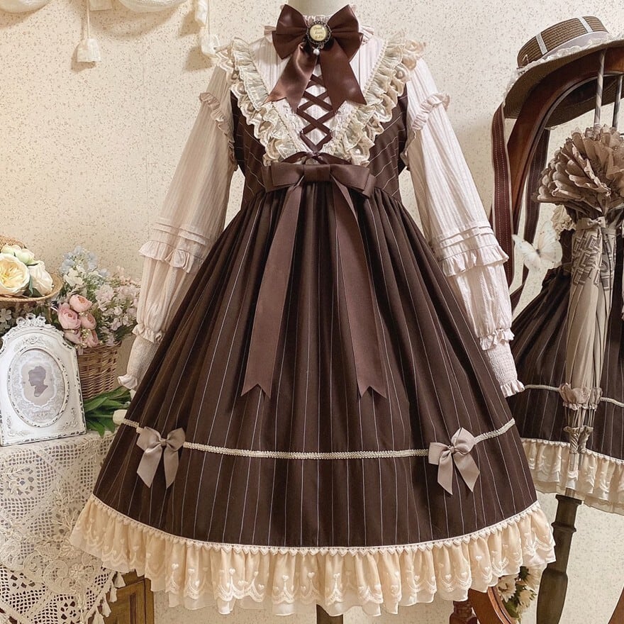 ブラウンを基調にした編み上げとリボン、レースフリルが特徴で、おでかけやお茶会で上品なクラロリコーデを楽しみたい日に最適です。落ち着いた配色とふんわり広がるシルエットが重なり、甘さを保ちながらも気品ある印象にまとまります。