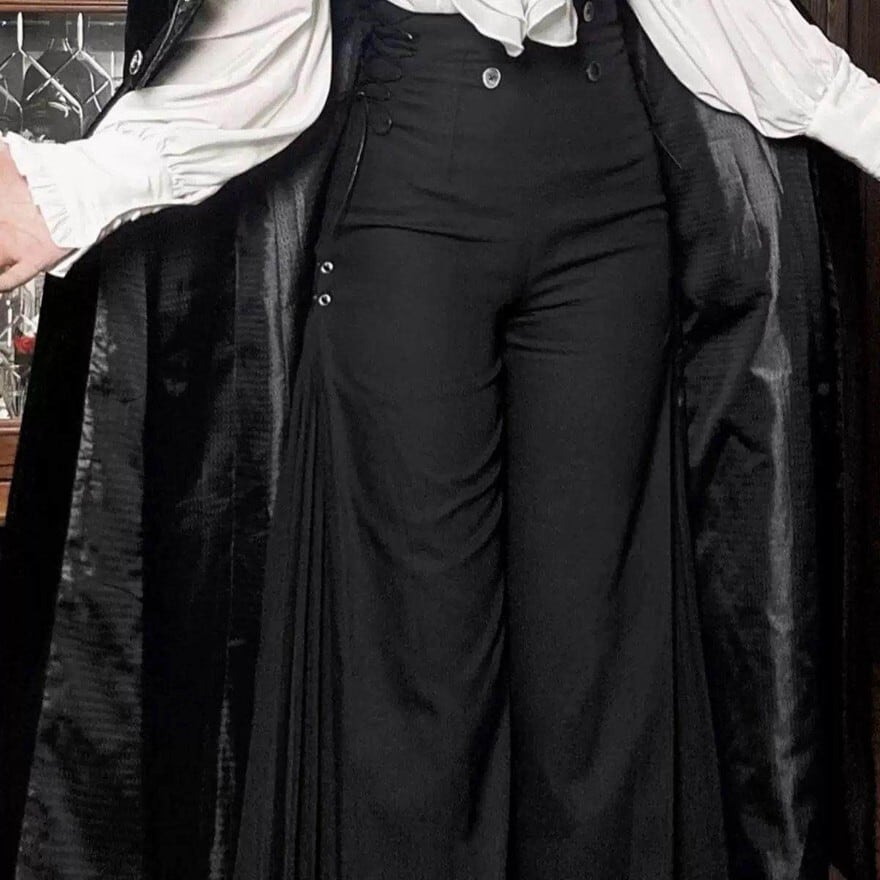 ワイドパンツは楽に着られる一方で、重たく見えたり、シンプルすぎて物足りなく感じたりすることがあります。このパンツは高めのウエスト位置で腰まわりを引き締めながら、裾へ向かってまっすぐ落ちるラインとロングレイヤーで印象を縦に流しやすいのが魅力です。黒ブラウスでまとめれば静かな退廃感に、ボルドーや深紅のトップスを合わせれば大人ゴシックらしい華やぎも加わり、パンツスタイルでも物語性のあるコーデに仕上がります。