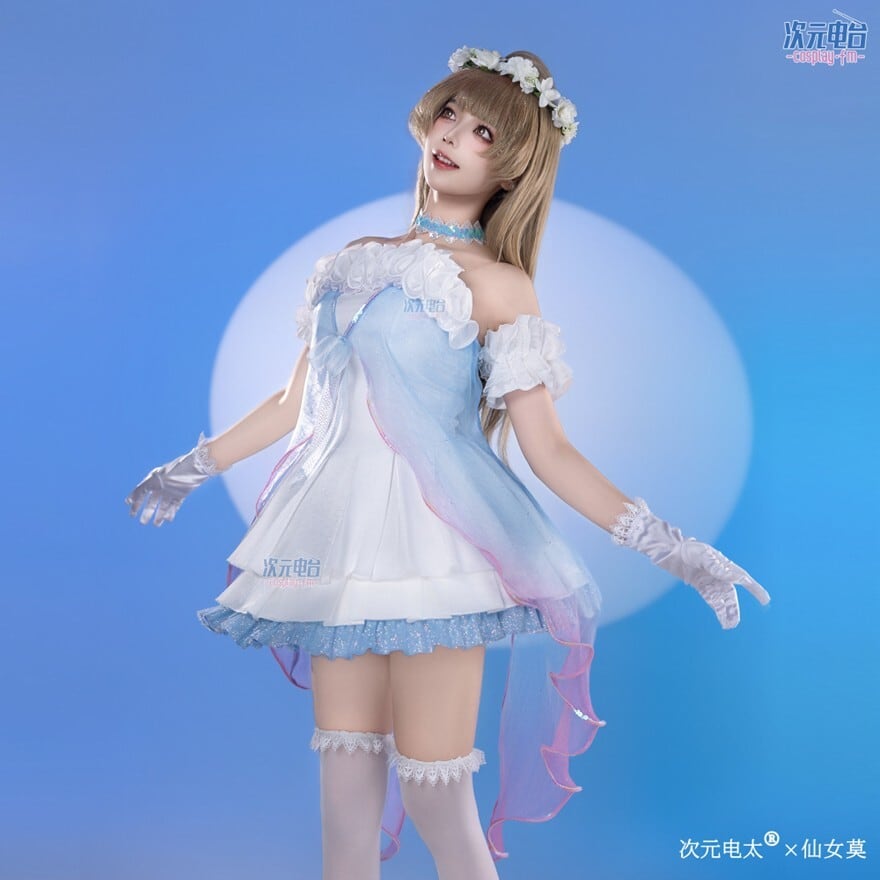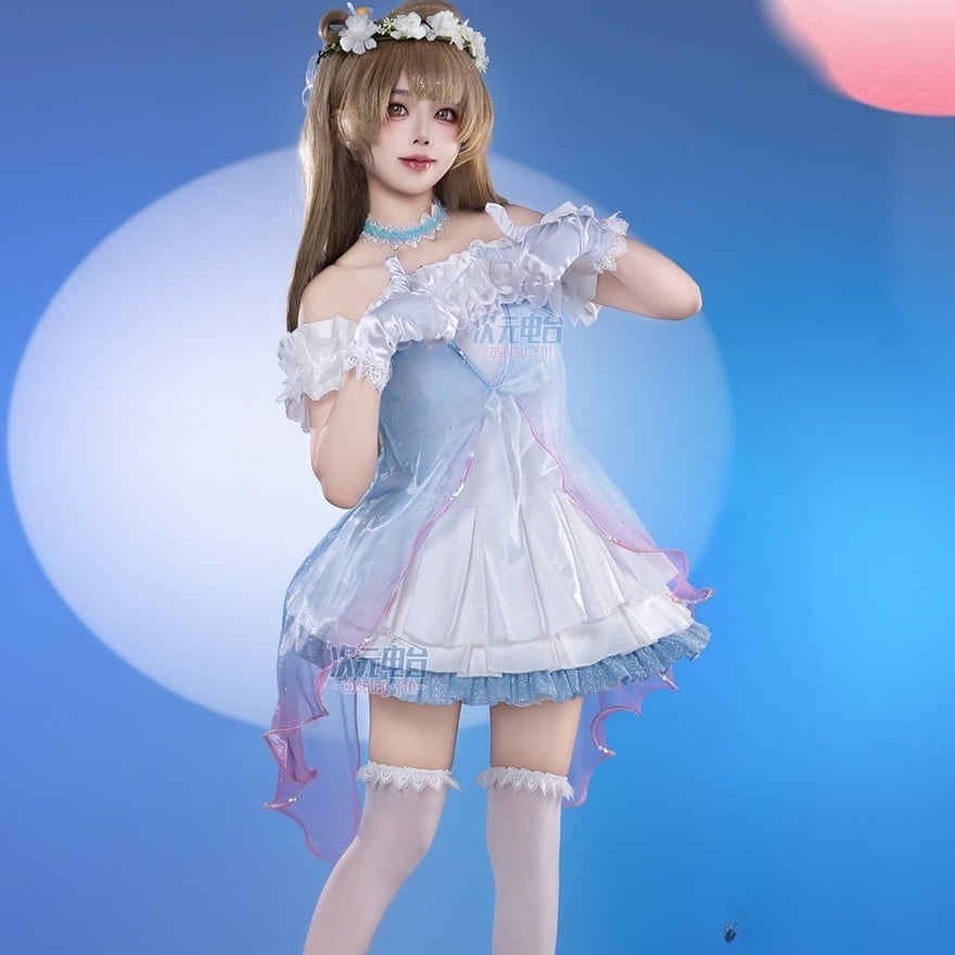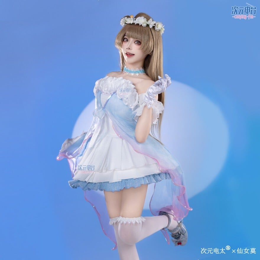 澄んだ空の色をそのまま閉じ込めたような、透明感あふれるアイドルドレス。光を受けるたびにきらめく裾と揺れるチュールが、夢の中のヒロインのような余韻を残します。