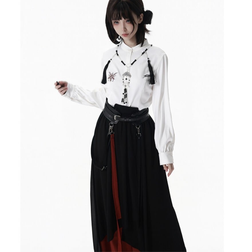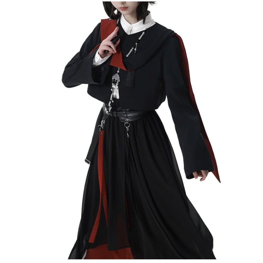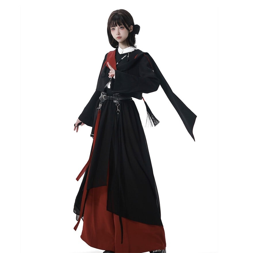 ブラック×レッドの配色とレイヤードデザインが特徴で、おでかけやイベントで甘さを抑えた地雷系コーデを楽しみたい日に最適です。ワイドシルエットの落ち感に、揺れる黒の重なりと赤の差し色が映え、静かな存在感のあるスタイルにまとまります。