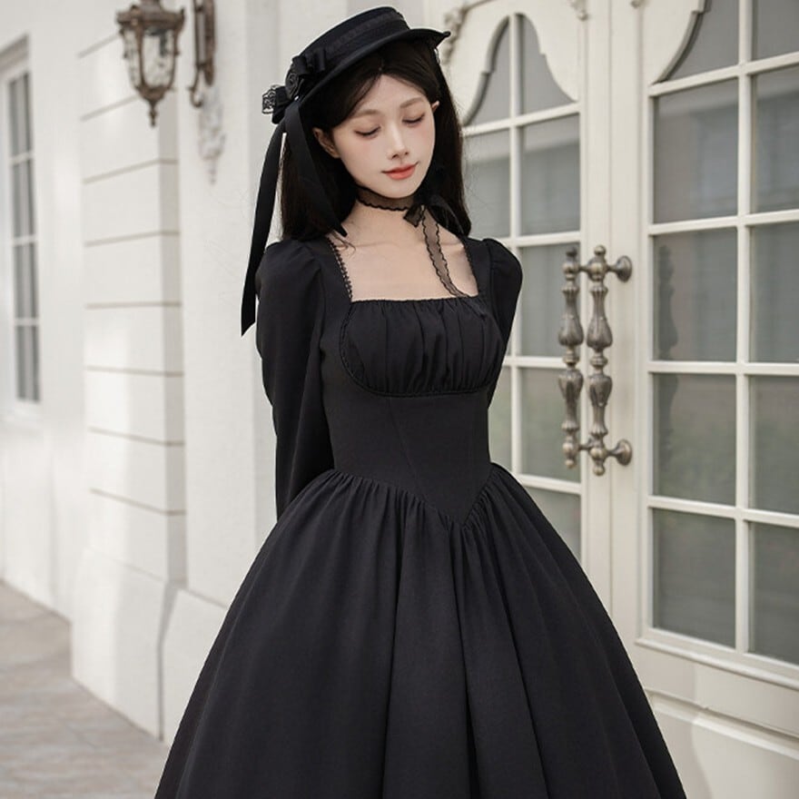 ワンピース:ブラックのロング丈ワンピース。スクエアネックと長袖でクラシカルなシルエット。
