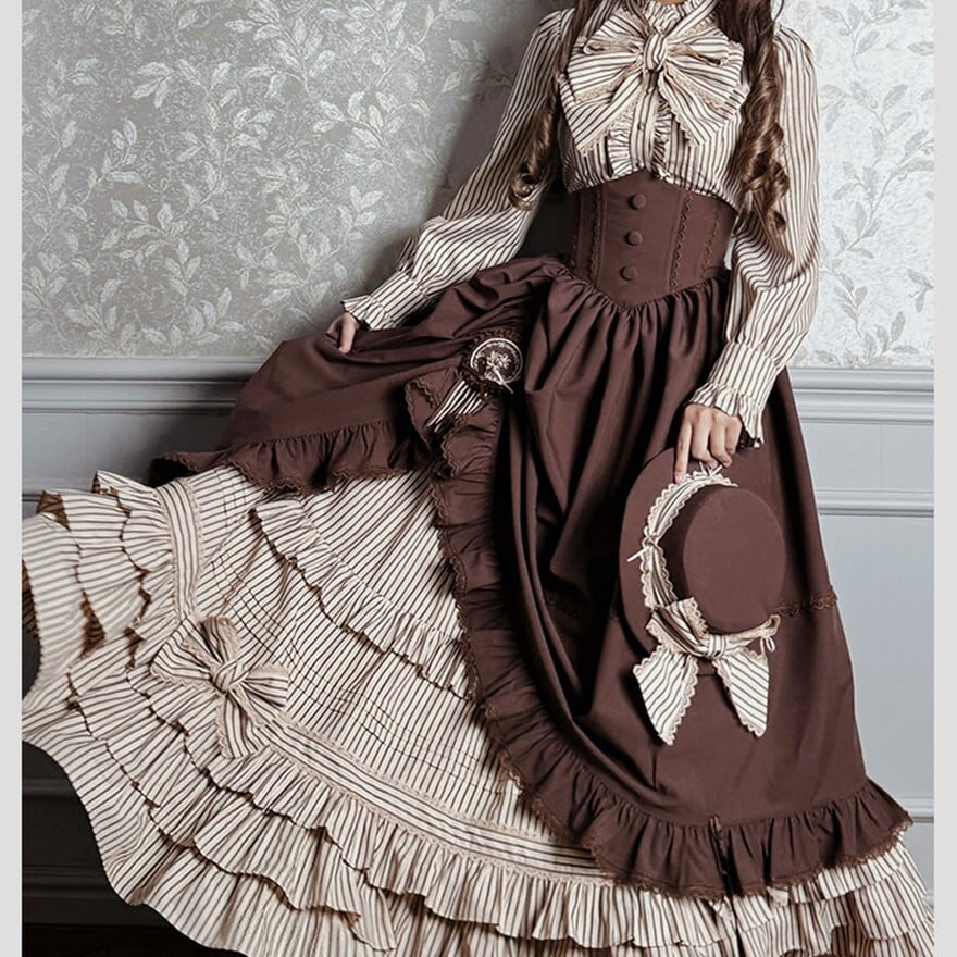 羽織り・ブラウス・スカートを重ねたヴィクトリアン調の構成が特徴で、お茶会や撮影会で気品あるクラシカルロリータコーデを楽しみたい日に最適です。縦ストライプとドレープ感のある重なりが、優雅で物語性のある佇まいを引き立てます。