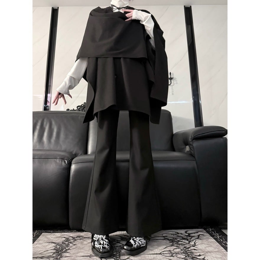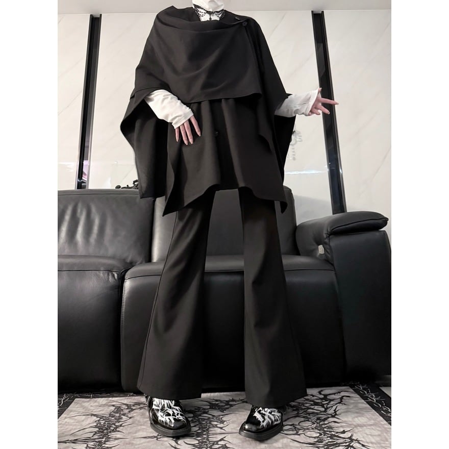 この一着はクロークを思わせる広がりと落ち感があるため、シンプルなインナーやスラックスに合わせるだけでも奥行きのある大人ゴシックコーデにまとまります。