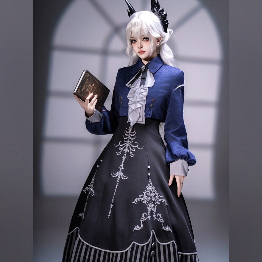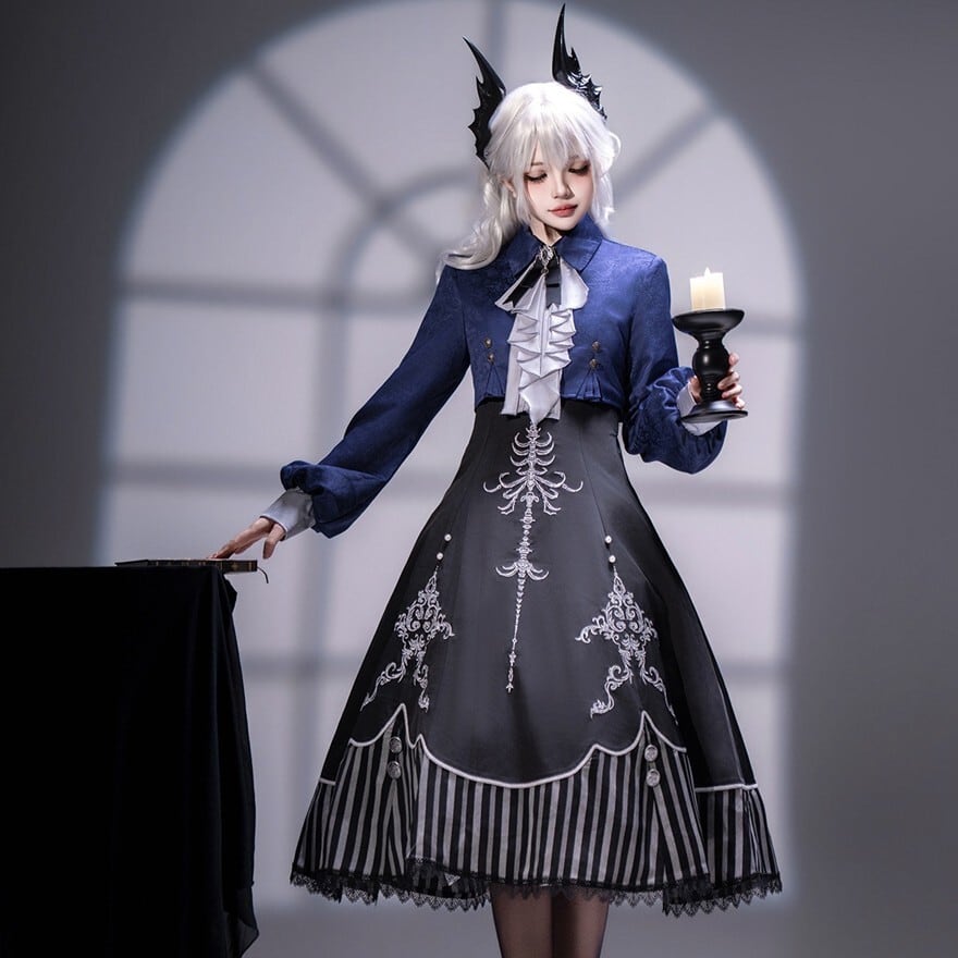 スケルトン刺繍のジャンパースカートとボレロが特徴で、撮影会やゴシックイベントに最適です。ブラックを基調にネイビーの気品を重ねた配色が、静かな退廃感とクラシカルな存在感を引き立てます。