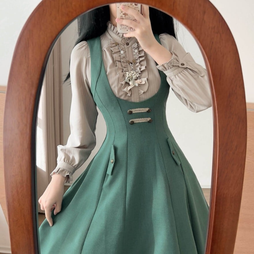 A. はい。スタンドカラーと胸元フリルがほどよく映えるため、ジャンパースカートやハイウエストスカートのインナーとして合わせやすいデザインです。