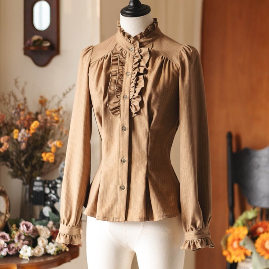 無地の上品な表情と胸元フリル、スタンドカラーが特徴で、お茶会や撮影会で気品あるクラシカルコーデを楽しみたい日に最適です。落ち着いたベージュ系カラーがやわらかな空気を纏わせ、ジャンパースカートやロングスカートに合わせるだけで端正な装いにまとまります。