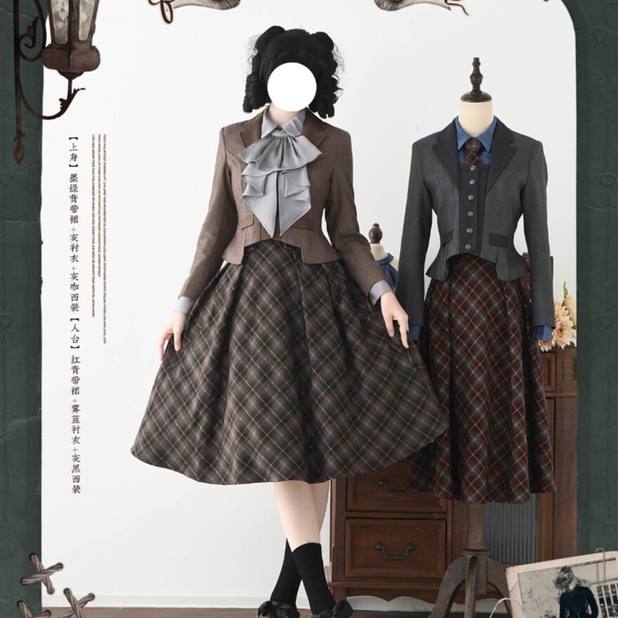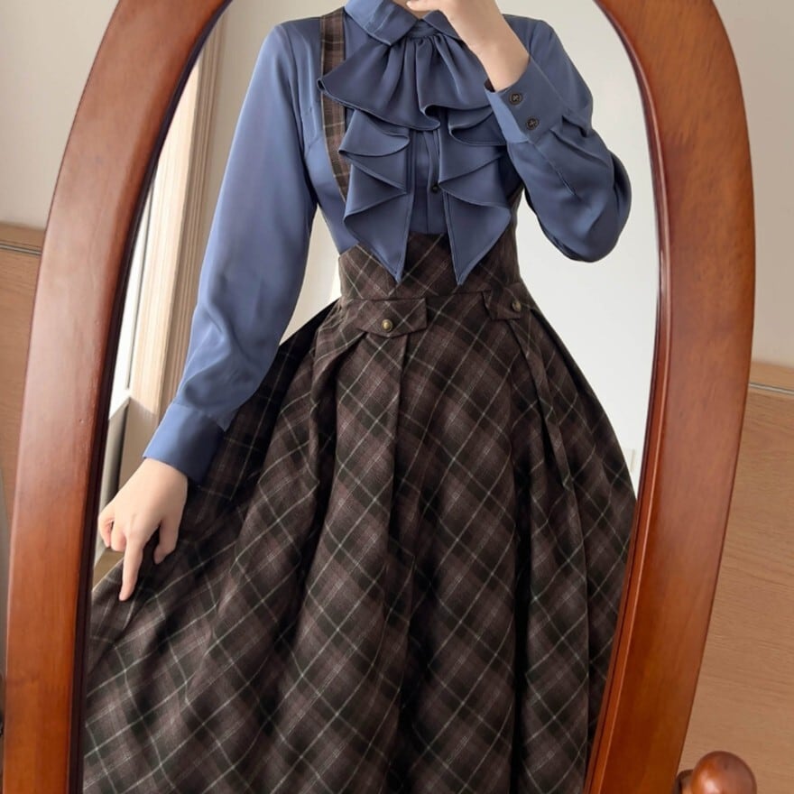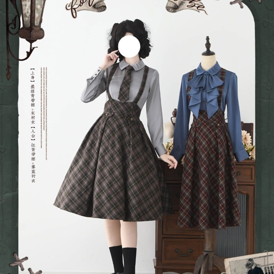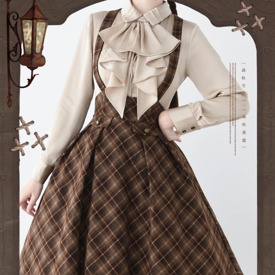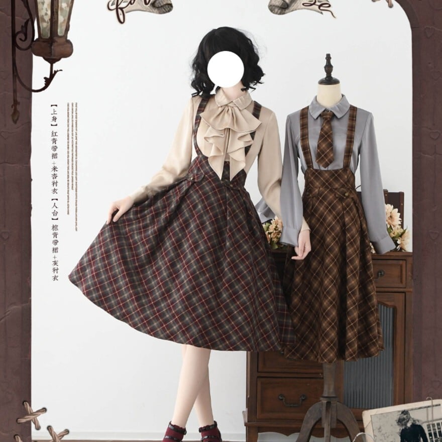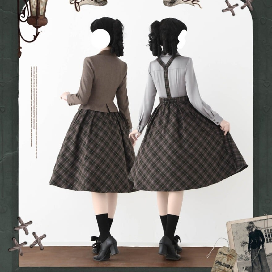 チェック柄とハイウエストコルセット風デザインが特徴で、お茶会や撮影会で知的なクラシカルコーデを楽しみたい日に最適です。サスペンダーとネクタイが装いに統一感を添え、落ち着いた配色の中に静かな気品を宿します。