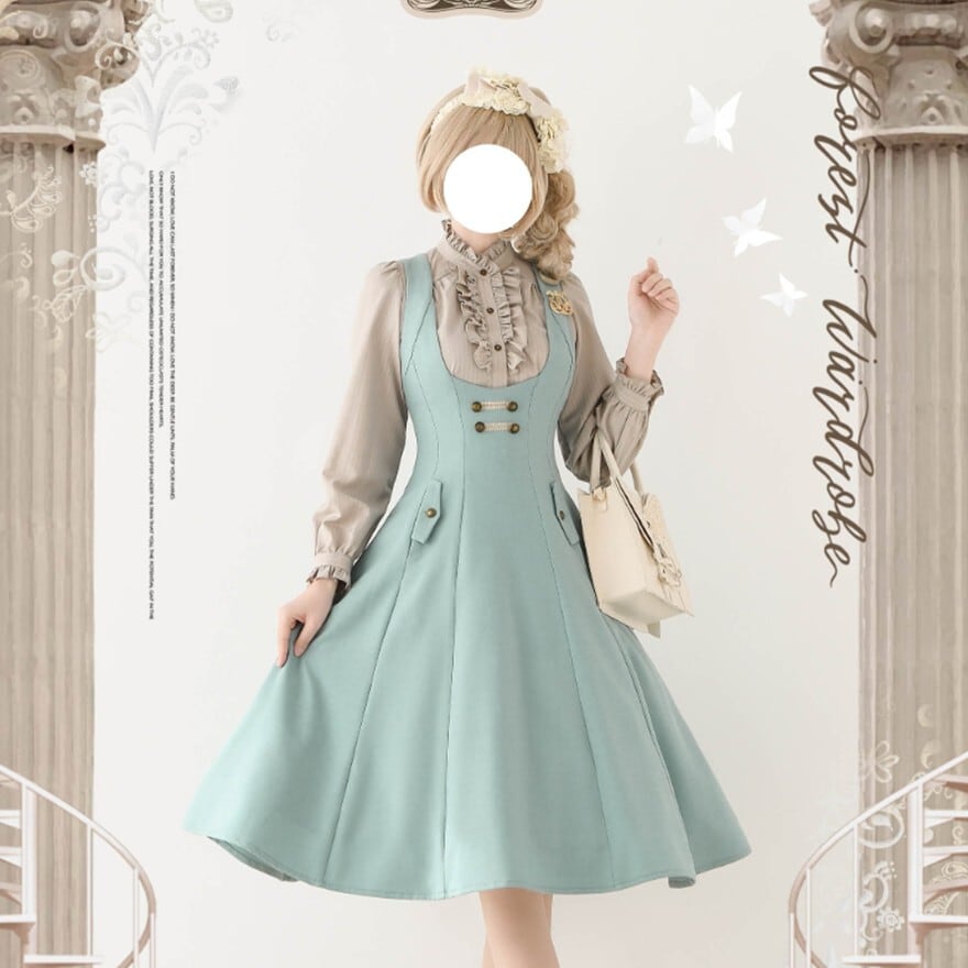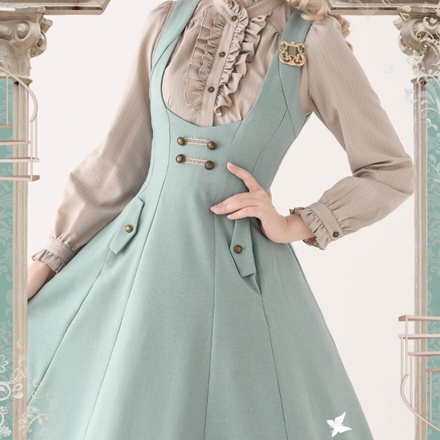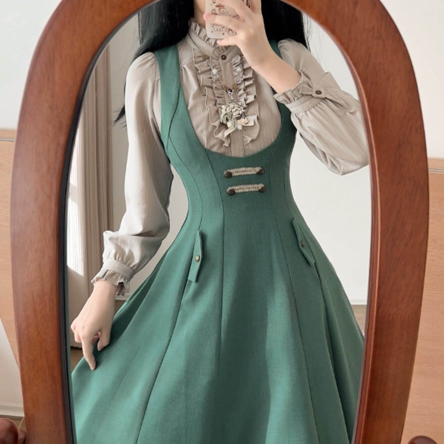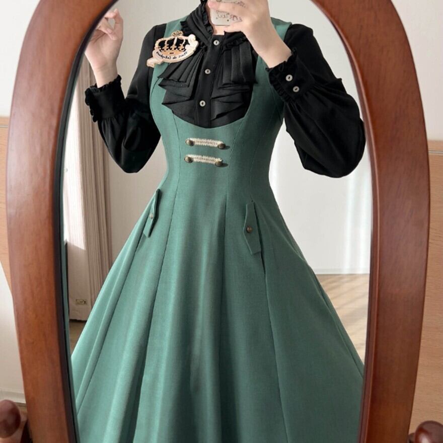 深Vネックとハイウエスト風の切り替え、上品に広がるフレアシルエットが特徴で、お茶会や撮影会で落ち着いたクラシカルコーデを楽しみたい日に最適です。装飾を抑えた端正なデザインが、知的でやわらかな令嬢の空気を引き立てます。