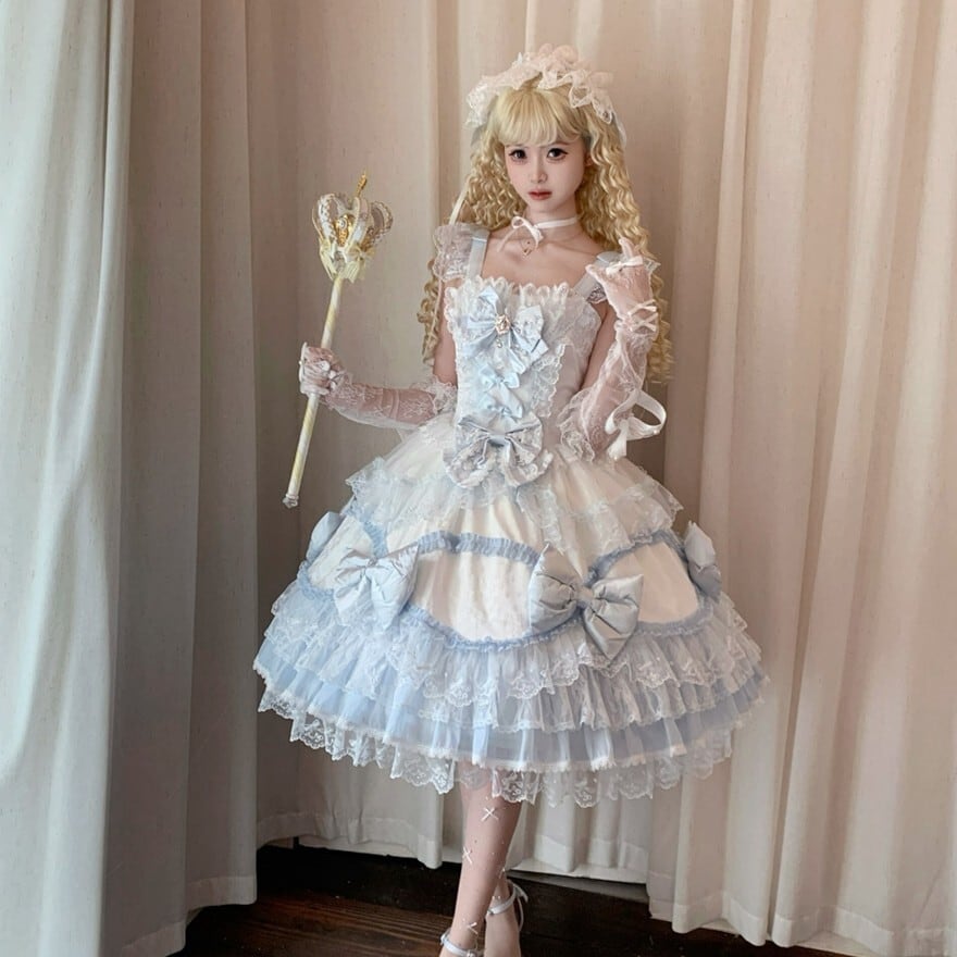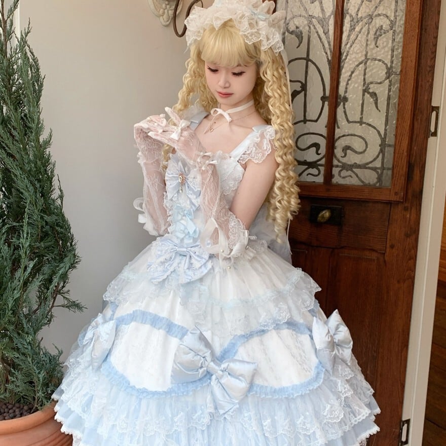 幾重にも重なるレースフリルと贅沢に配された大きなリボン、印象的なバックリボンが特徴で、お茶会や撮影会、特別なおでかけに最適です。サックスブルー、レッド、ピンクの3色展開で、それぞれ異なる甘さを楽しみながら、華やかでロマンティックなシルエットを演出できます。