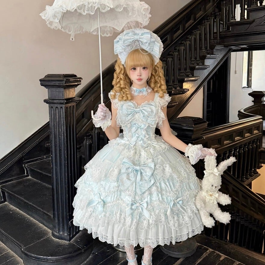 幾重にも重なるレースフリルと贅沢に配された大きなリボンが特徴で、お茶会や撮影会、ロリータイベントに最適です。サックスブルーとピンクのやわらかな色彩が、纏うだけで可憐な存在感と夢のような余韻を引き立ててくれます。