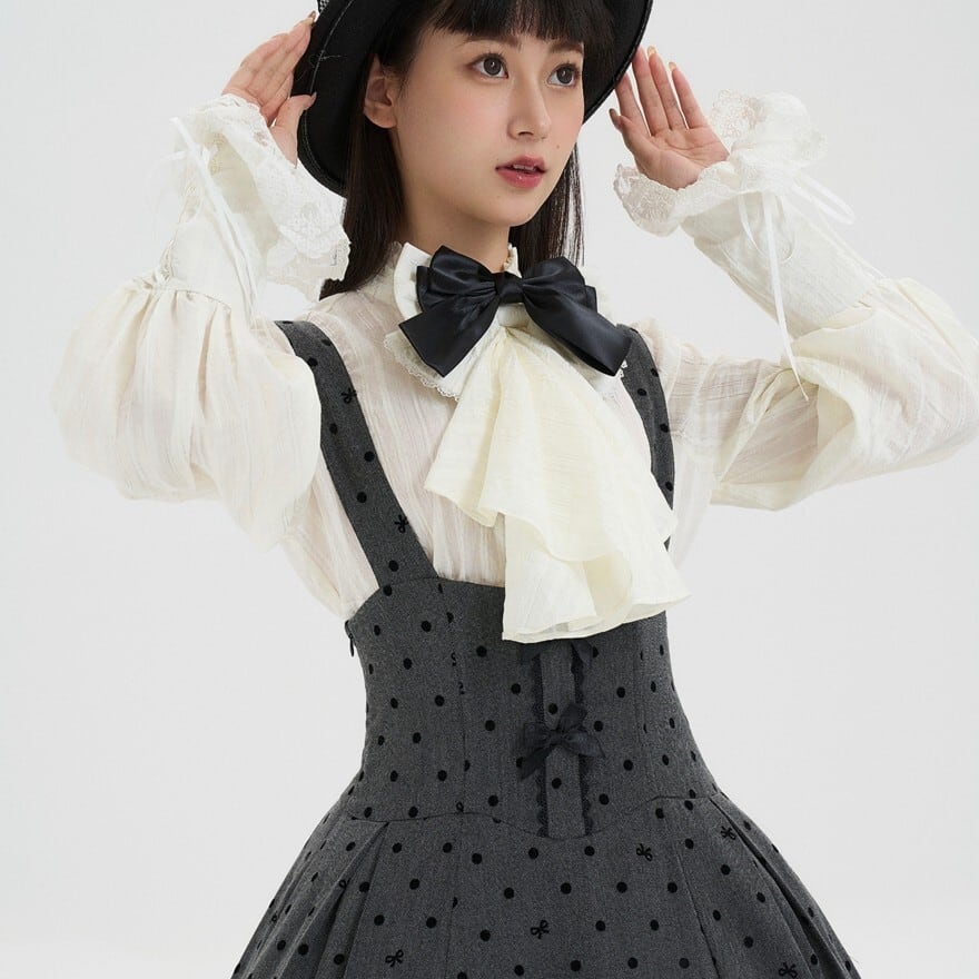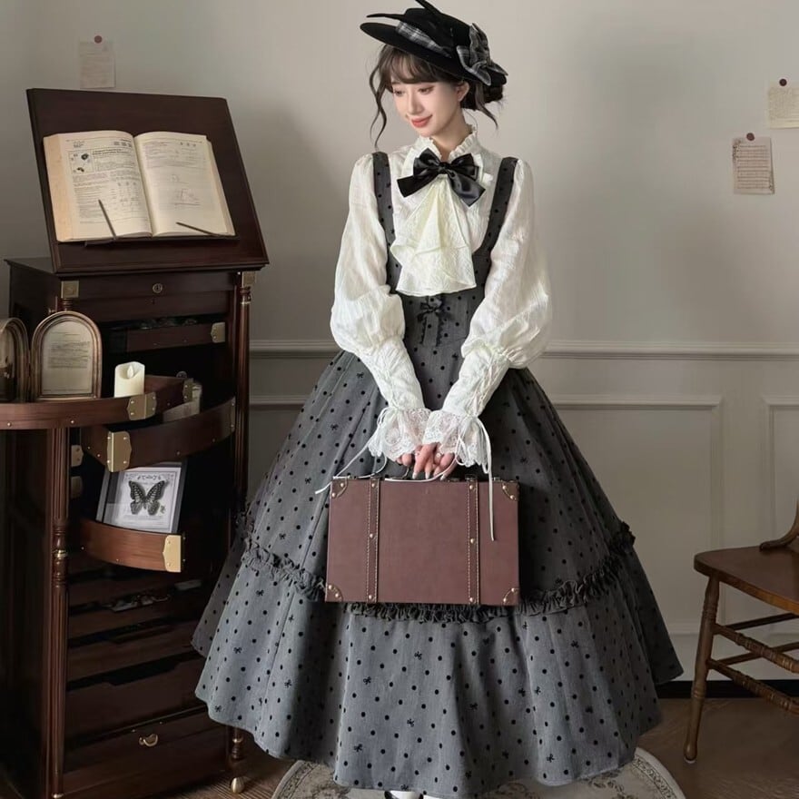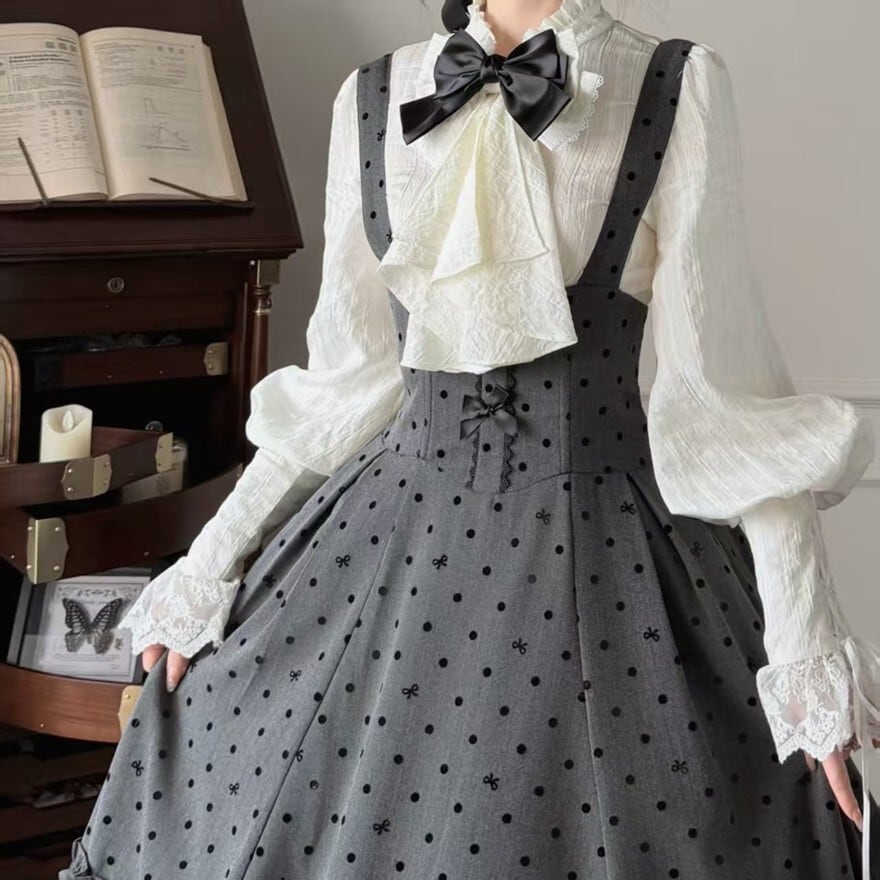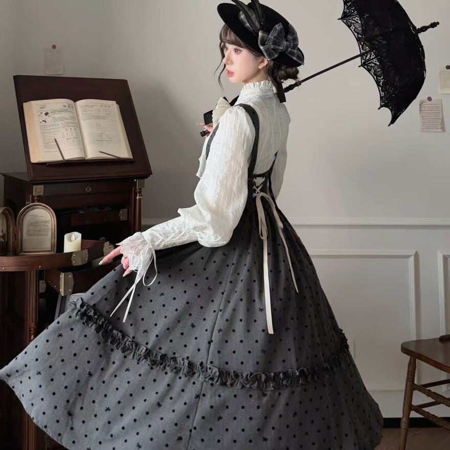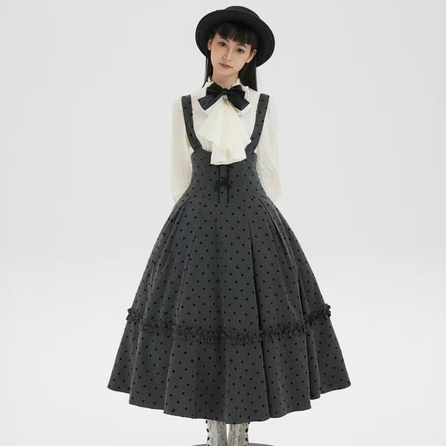 ドット柄のジャンパースカートとフリルブラウスの組み合わせが特徴で、お茶会や撮影会、クラシカルなおでかけに最適です。落ち着いたグレー×ブラックにホワイトブラウスを重ねた配色が、知的で気品あるロリータスタイルを印象的に引き立てます。