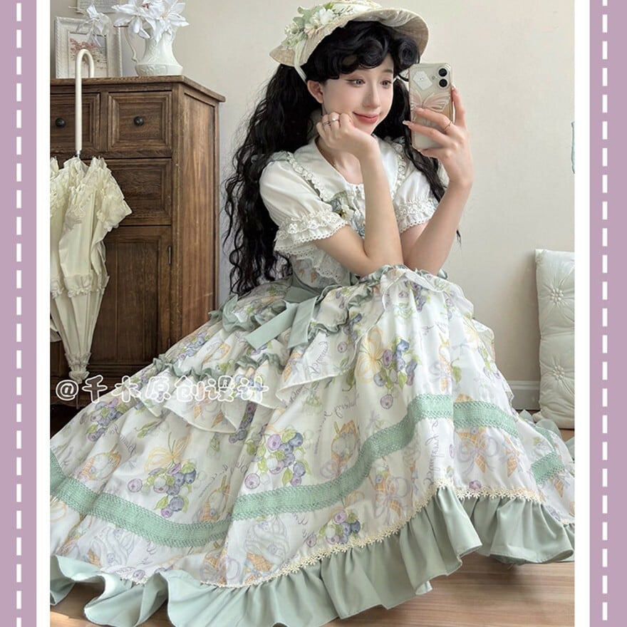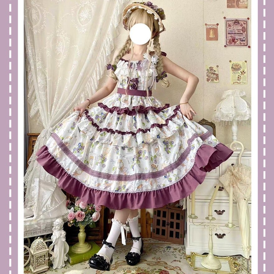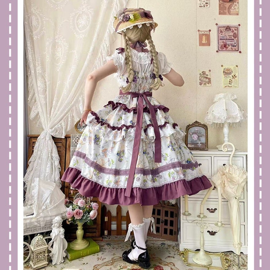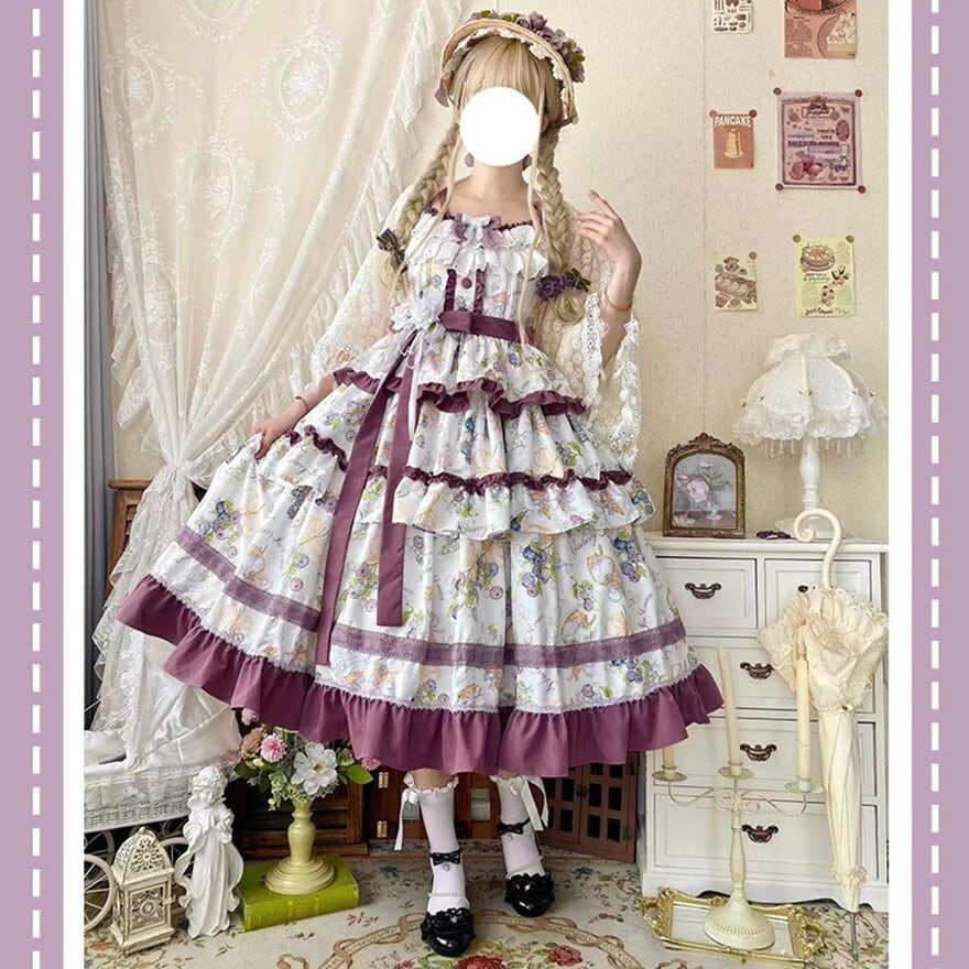 花柄プリントとティアードフリル、配色リボンが特徴で、お茶会や撮影会、クラシカルなおでかけに最適です。やわらかな総柄に段フリルを重ねた華やかなシルエットが、上品で物語性のあるロリータスタイルを引き立てます。