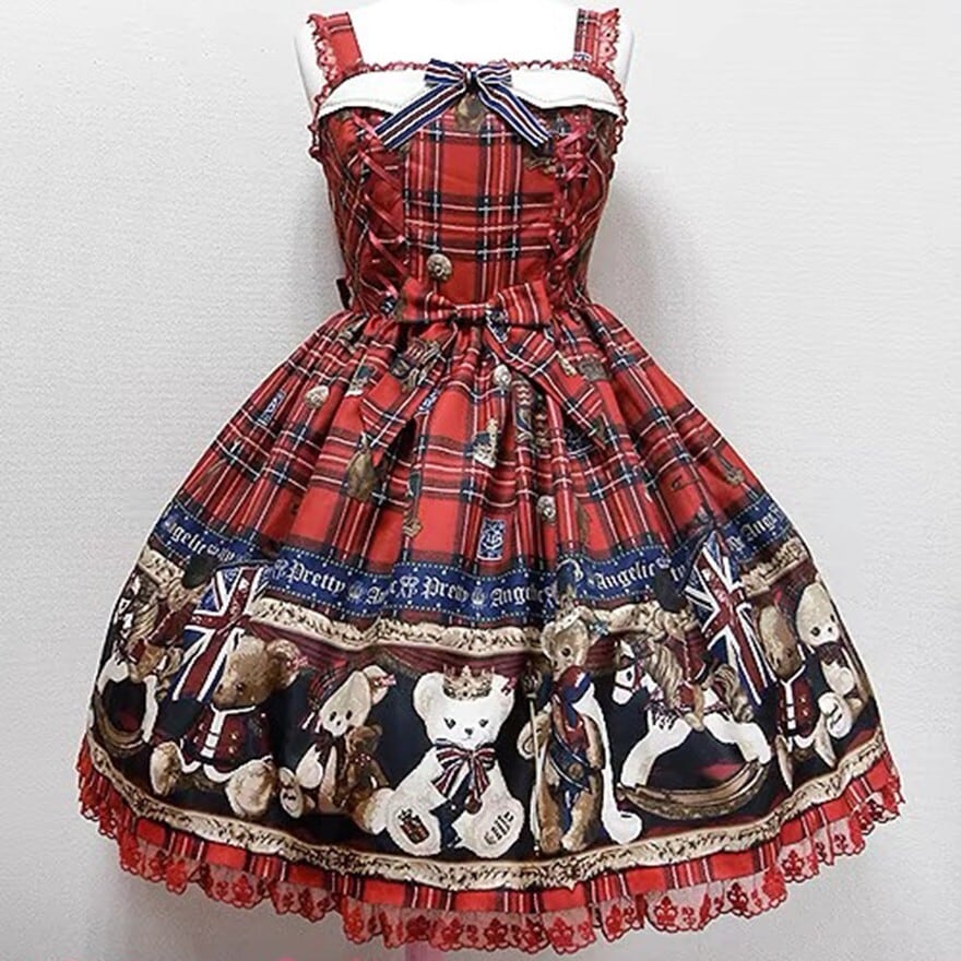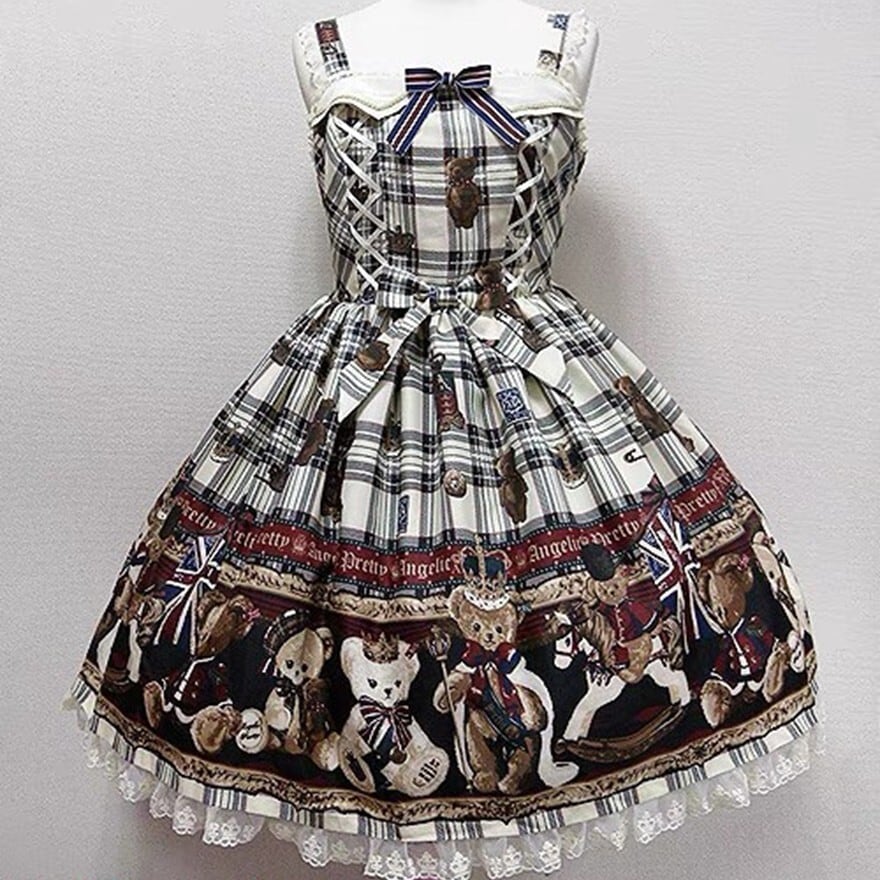 クラシカルなチェック柄にテディベアプリントを重ねた印象的なデザインが特徴で、お茶会や撮影会、クラシカルなおでかけに最適です。