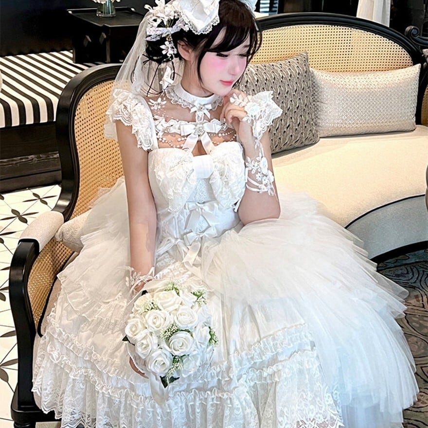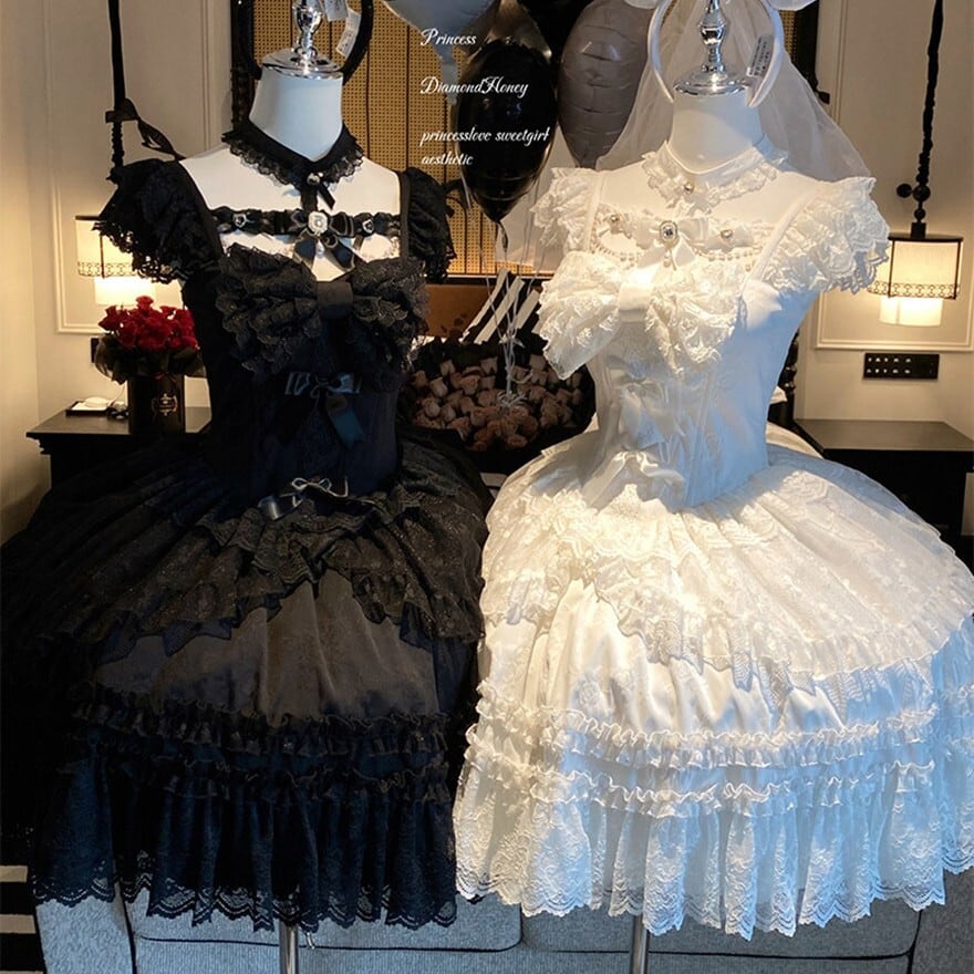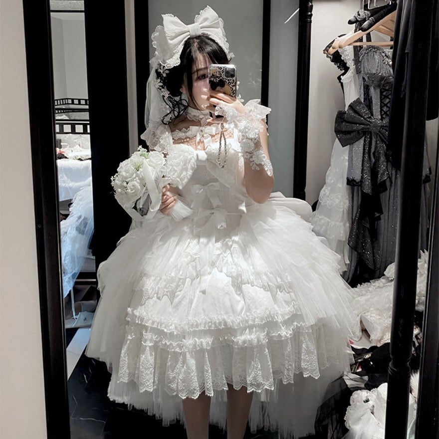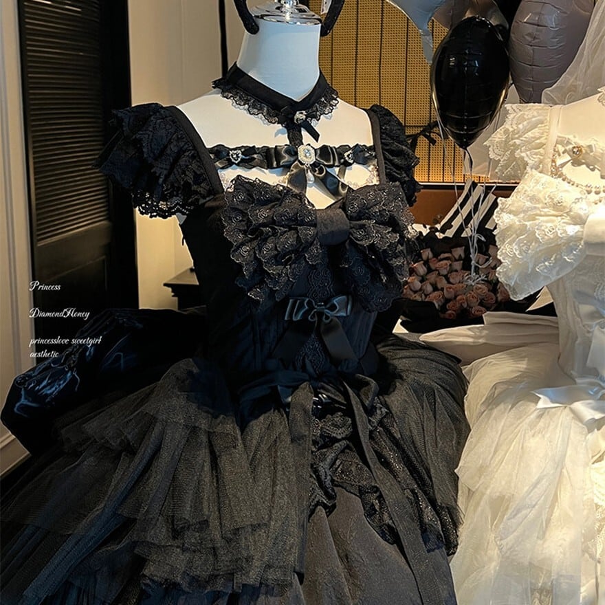 ゴスロリドレスは華やかさや重厚感を出したい一方で、平面的に見えたり、前からの印象だけで終わってしまうことがあります。この一着は、前短後長の裾構成とティアードチュールによって、立った姿だけでなく歩いたときや横から見たときにも印象を残しやすいのが魅力です。ブラックは王道ゴシックに、ホワイトは儚げで特別感のある装いに寄せやすく、世界観の強いコーデを一枚で整えやすくなります。