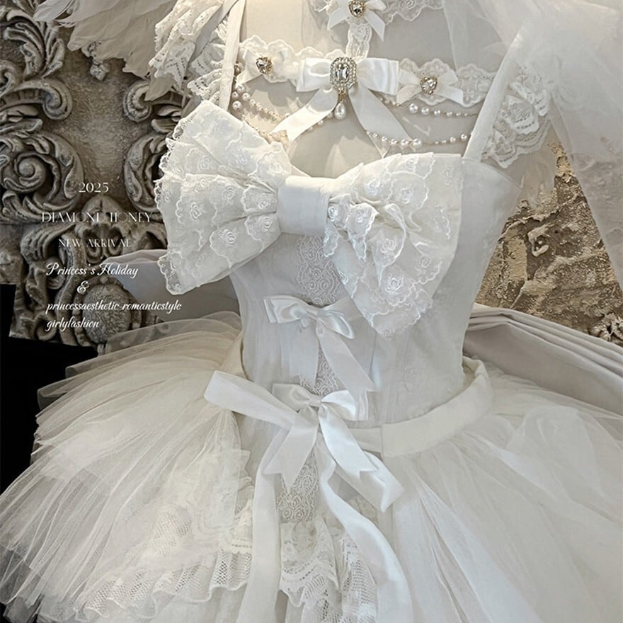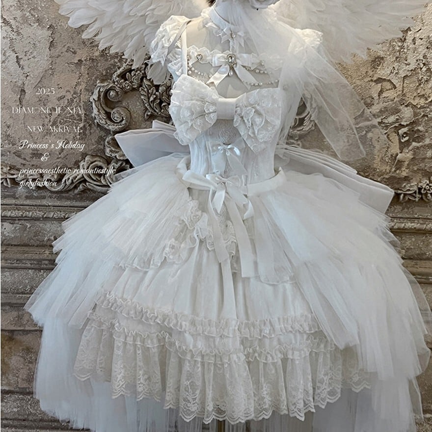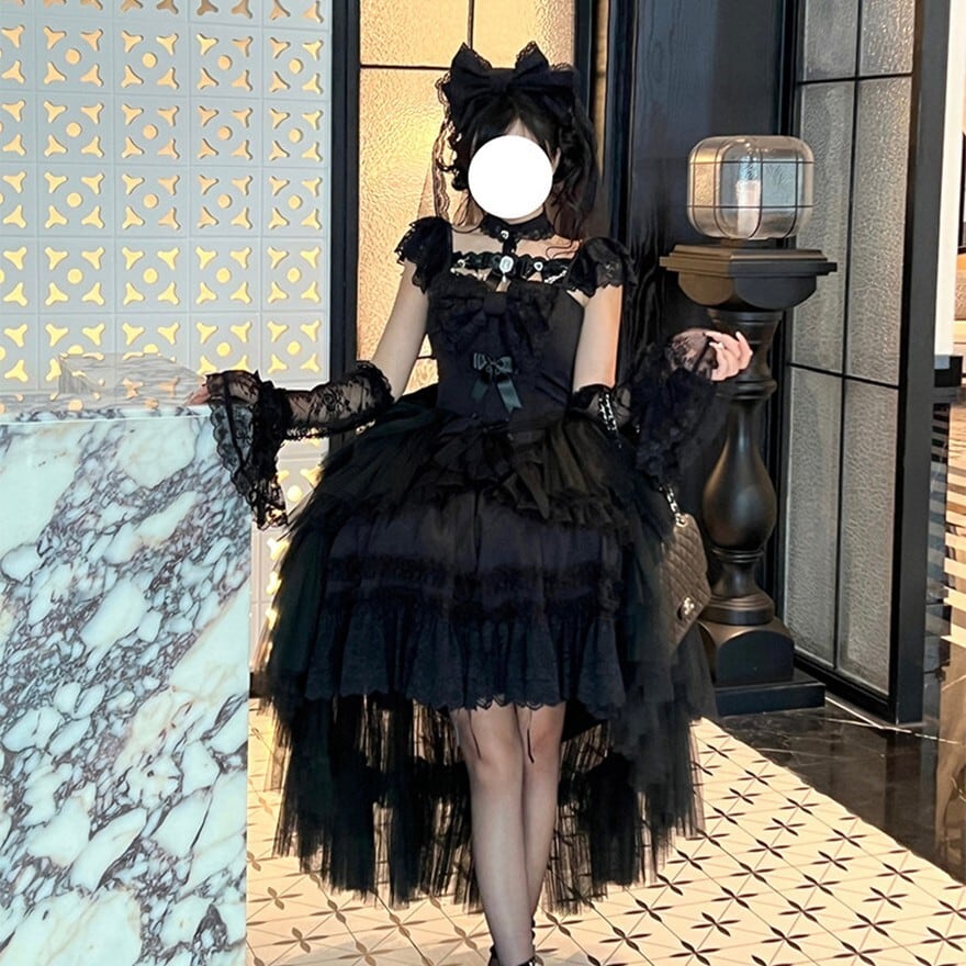 前短後長のドラマティックなシルエットに、幾重にも重なるチュールとレースフリルを重ねた存在感のある一着です。ブラックは退廃的で濃密なゴシック感を、ホワイトは儚く神秘的な気配を引き立て、撮影会やイベント、お茶会、特別な一日に映えるゴスロリコーデを完成しやすく仕上げています。