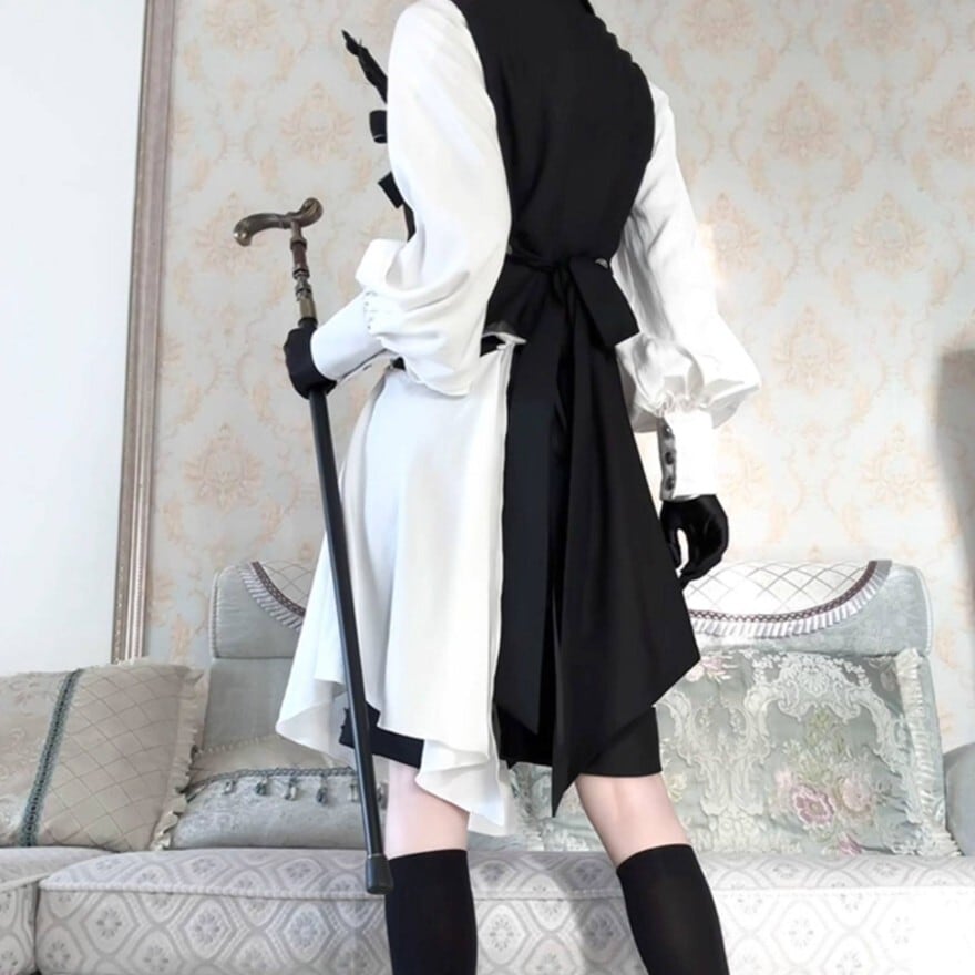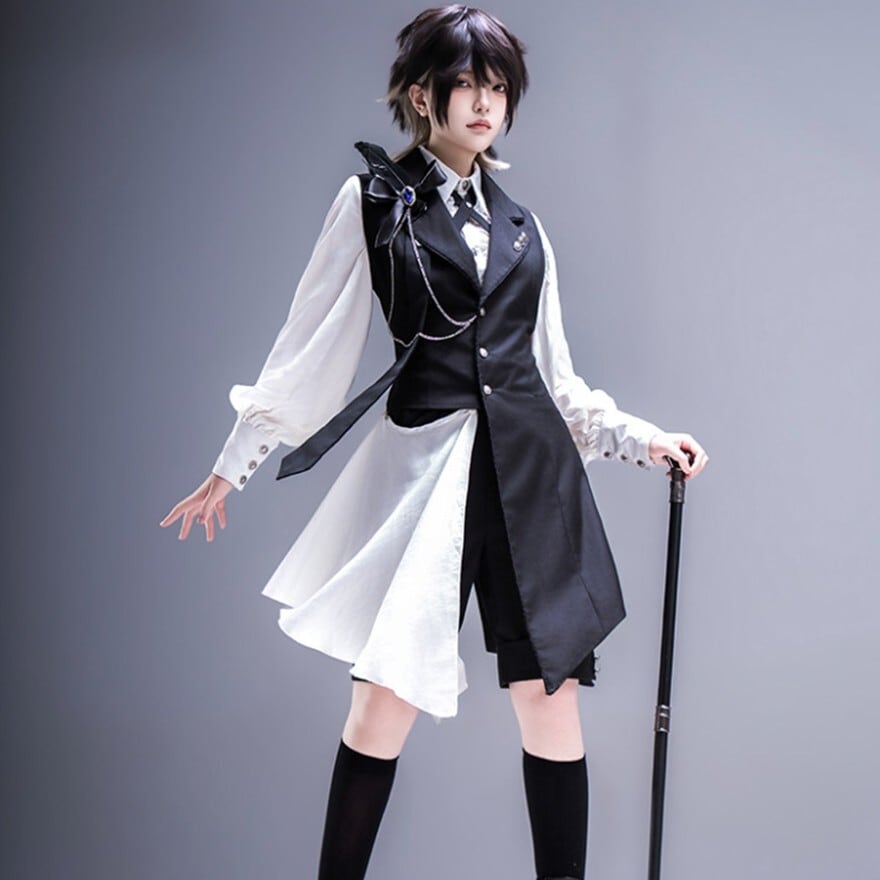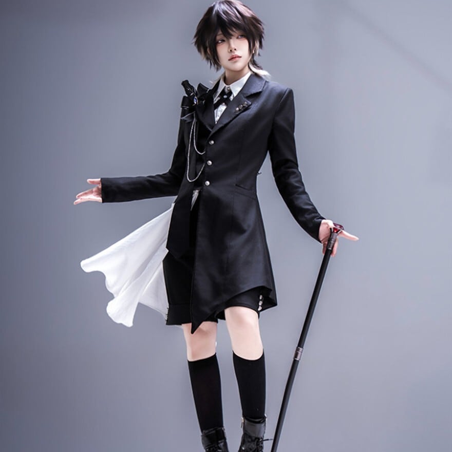 ベストコートまたは長袖コートに、ブラウスとハーフパンツを合わせた、モノトーン配色の存在感あるコスチュームです。アシンメトリーに流れる裾とロングタイ、チェーン装飾が凛とした印象を引き立て、撮影会、イベント、ステージ衣装、王子系コーデに映える一着に仕上がっています。