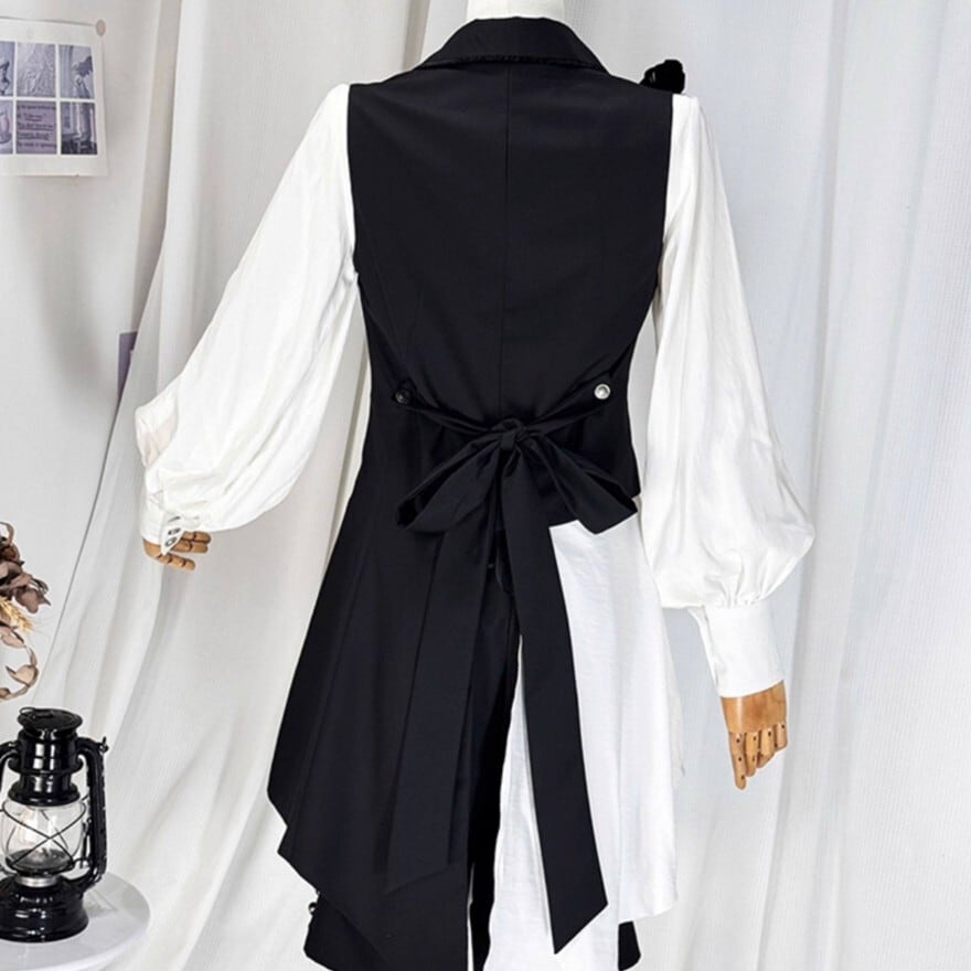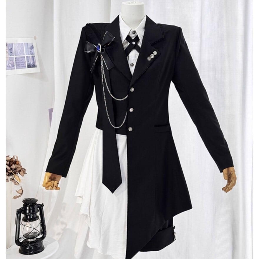 王子系や少年装は、きちんと感と個性を両立したい一方で、単調に見えたり、コーデ全体の完成度が不足しやすいことがあります。このセットアップは、コートの縦長ラインとアシンメトリーな切り替えで印象を強めながら、ブラウスとハーフパンツで全体のバランスを整えやすいのが魅力です。ベストコートは軽やかに、長袖コートはより端正に寄せやすく、好みにあわせて王子系の世界観を作りやすくなります。