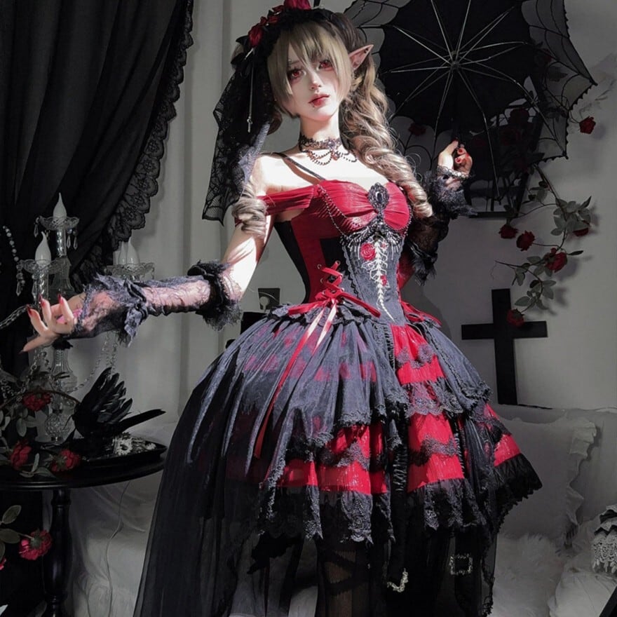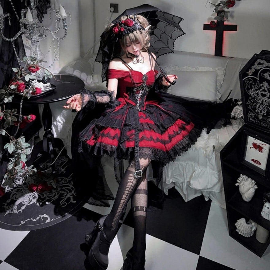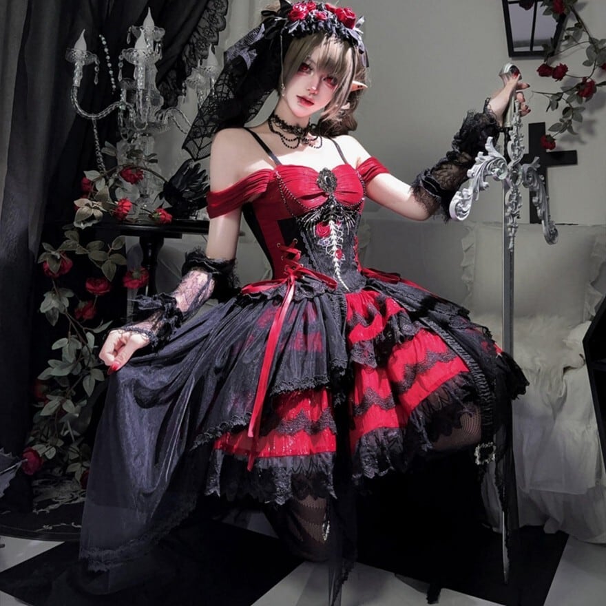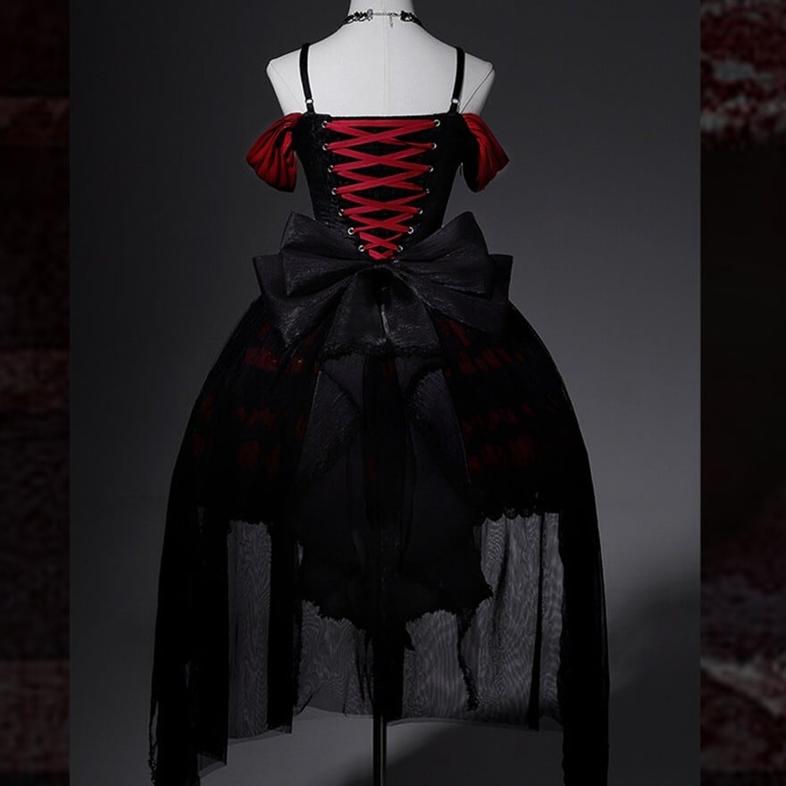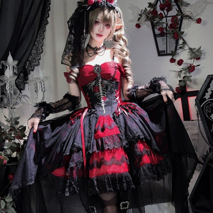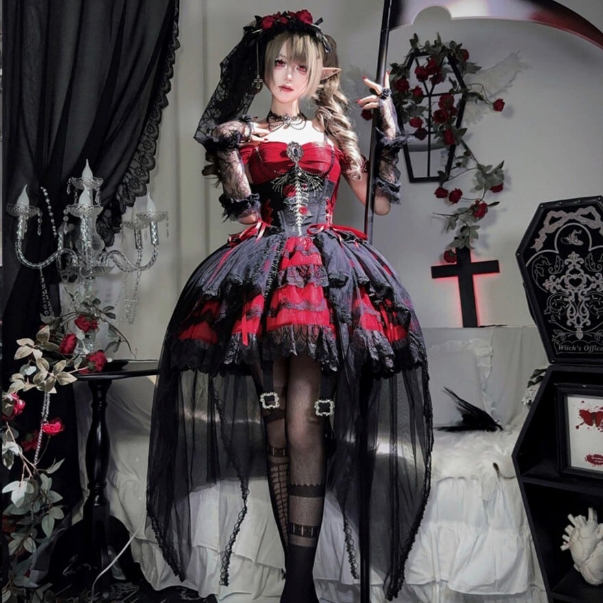 ブラックとレッドの強いコントラストに、薔薇モチーフと骨格風の刺繍、たっぷり重ねたレースとチュールを組み合わせた、退廃的で華やかなゴスロリジャンパースカートです。前は重厚に、後ろは透け感のある長いチュールで印象を残しやすく、撮影会やイベント、特別な一日に主役感のあるコーデを完成しやすく仕上げています。
