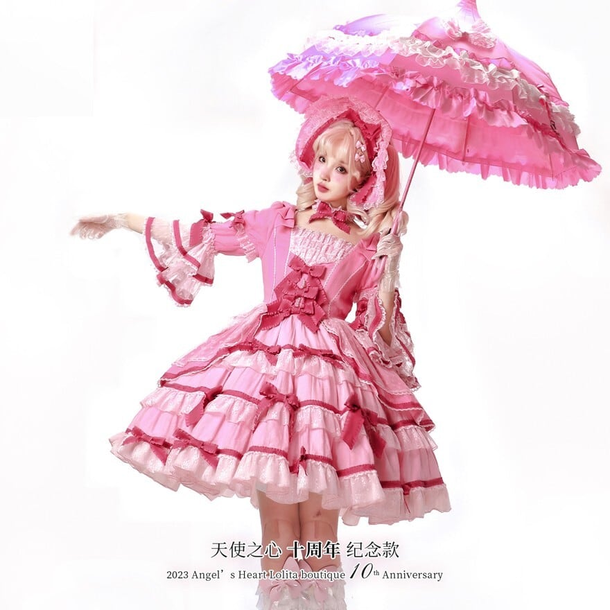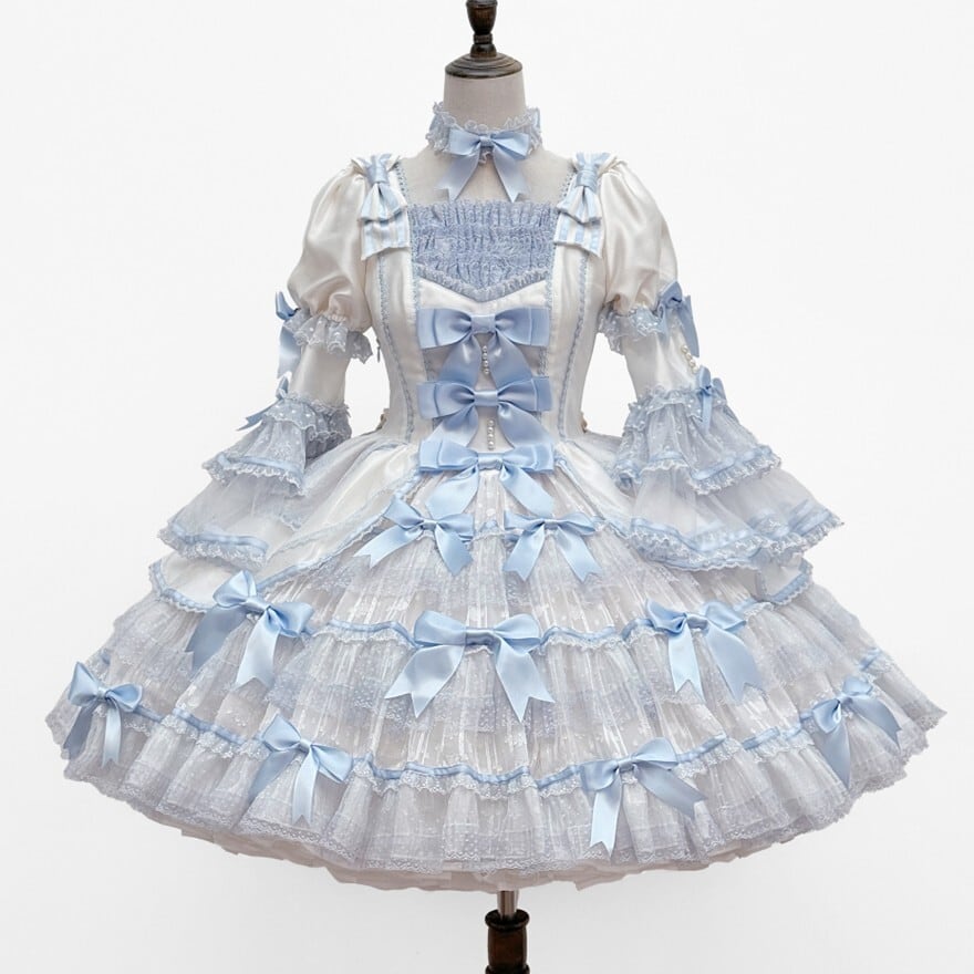 お人形のような立体感を引き立てるティアードフリルと、全身に散りばめられたリボン装飾が印象的な一着です。