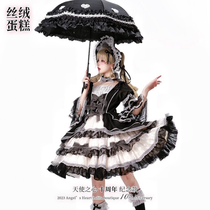一歩動くたびに揺れる段フリルが、夢の中のお姫様のような愛らしさを引き立てる、お人形風のロリータドレスです。