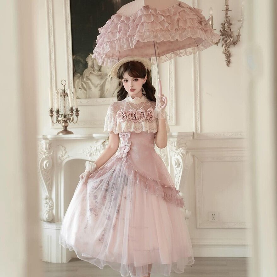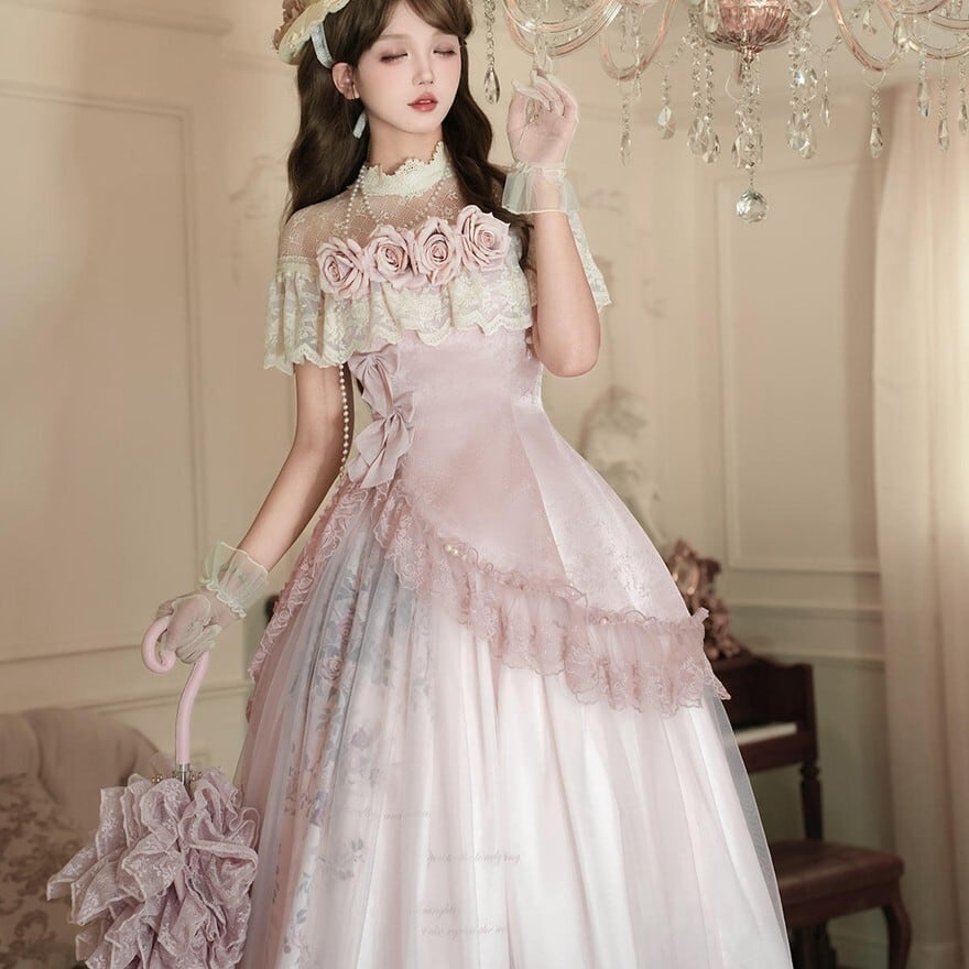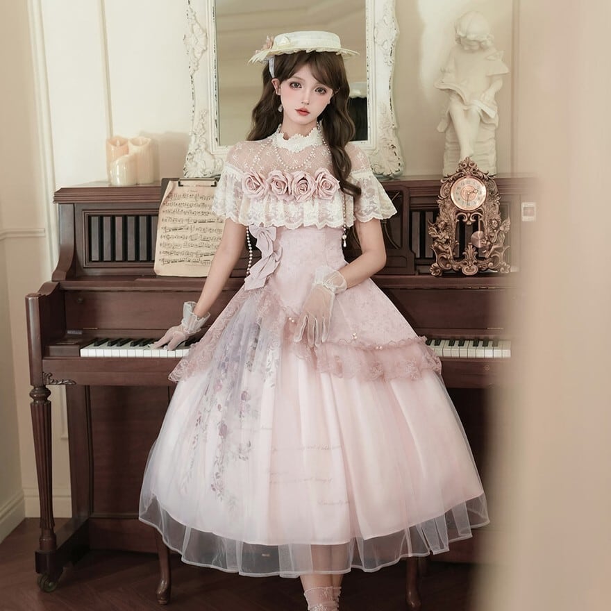 淡いピンクを基調に、やわらかなチュール、繊細なレース、ふんわり広がるシルエットを重ねることで、お茶会や撮影会、特別なおでかけに似合う優美な甘ロリコーデを完成しやすく仕上げています。