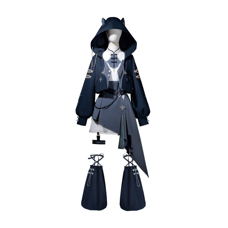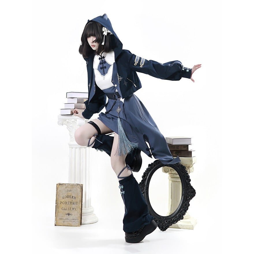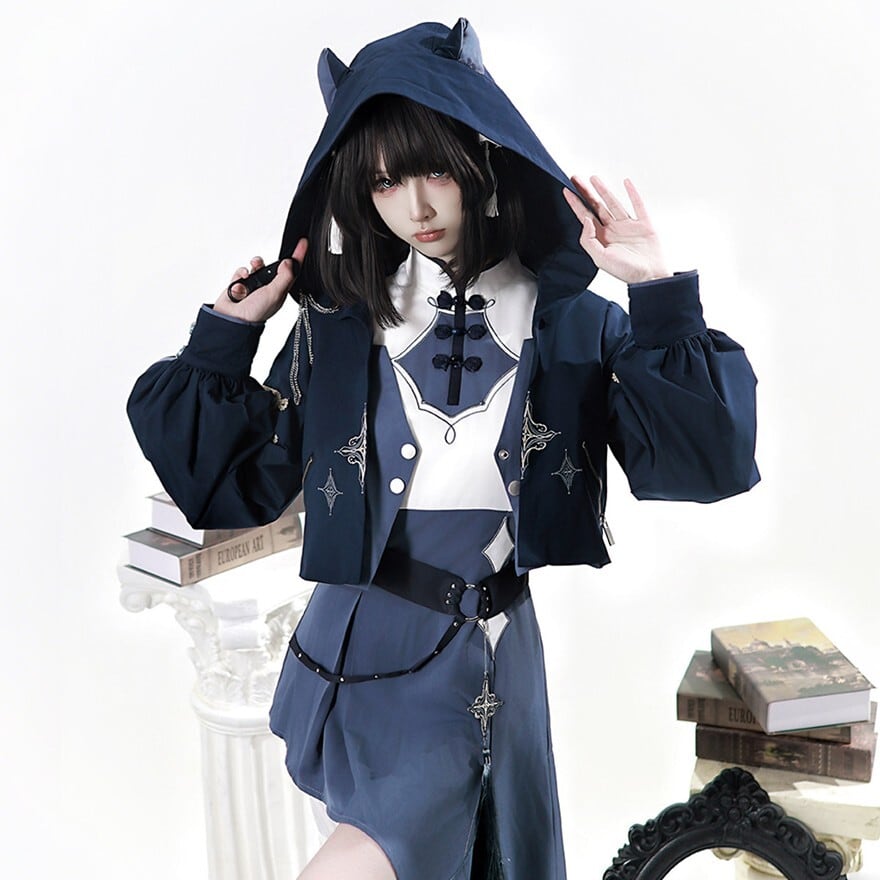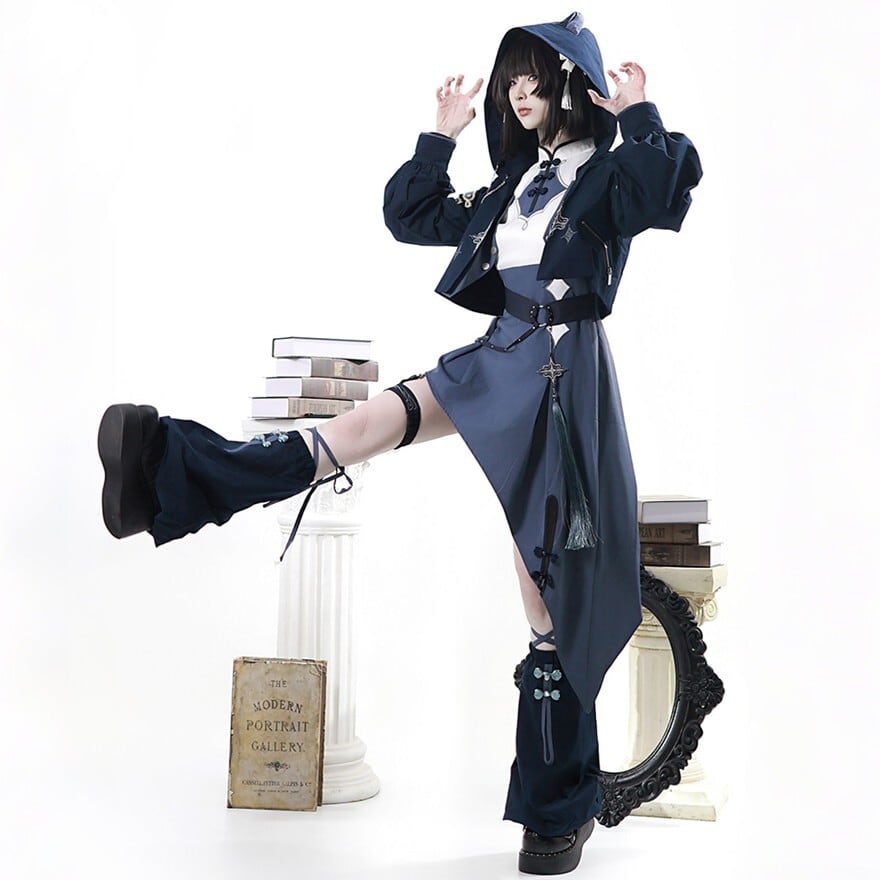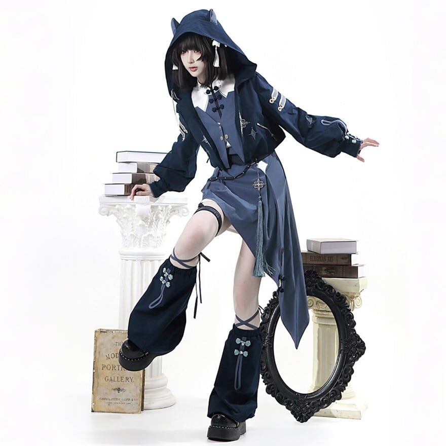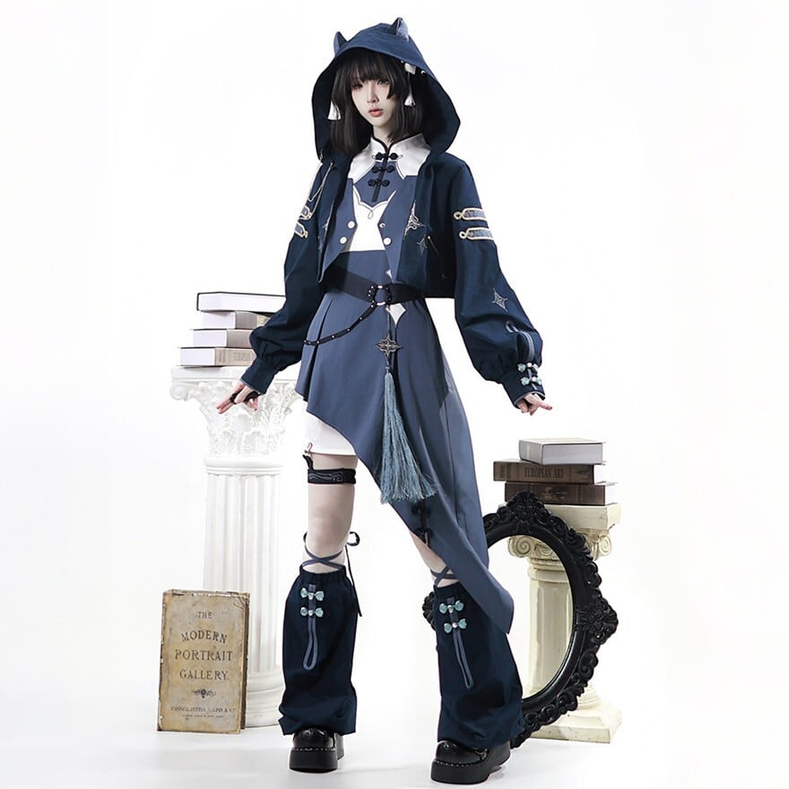 サイバーパンク風4点セットアップは、アシンメトリーなトップスデザインに、猫耳フード付きショートジャケット、レッグカバー、アクセサリーパーツを組み合わせた存在感ある一着です。ホワイト×ブルーグレー×ネイビーを基調にした近未来感のある配色で、イベント、おでかけ、撮影コーデに映えるスタイルを完成しやすく仕上げています。