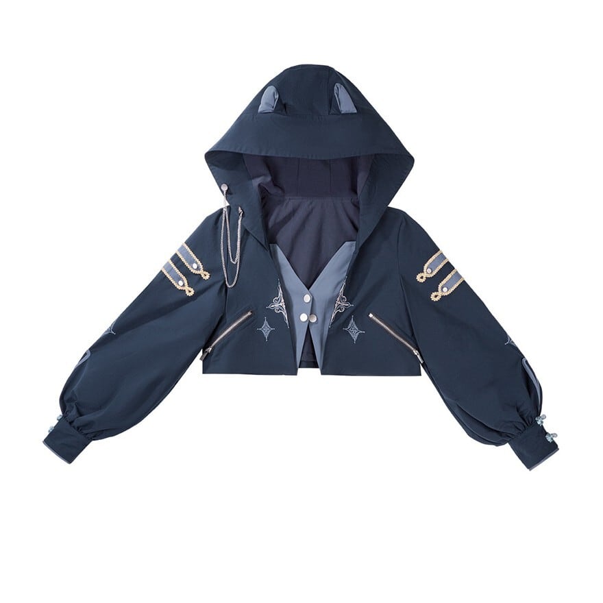 ・ショート丈のフードジャケットは猫耳付きで、クールさの中に遊び心を加えています。