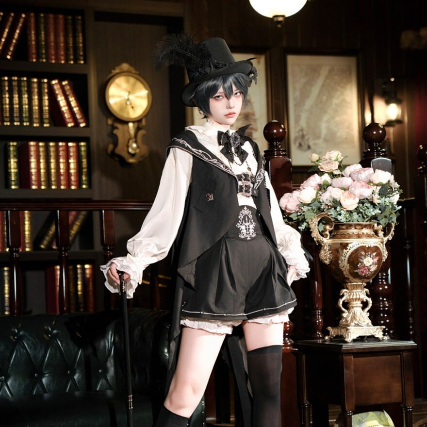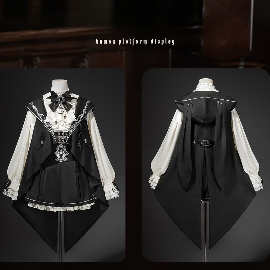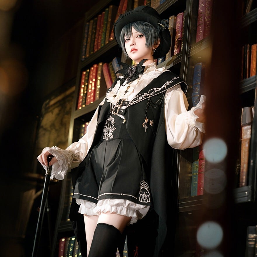 黒×白の配色にフリルブラウスとケープ風シルエットを重ねたデザインが特徴で、撮影会やゴシックイベントで気品ある存在感を纏いたい方に最適です。端正な少年感とロリィタらしい華やかさが重なり、1着で物語性のある装いが完成します。