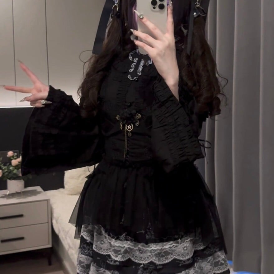 黒を基調にレースフリルを重ねたミニワンピースと上着の組み合わせが特徴で、撮影会やゴシックイベントで可憐さと退廃感を両立したい方に最適です。上着を重ねることで印象に奥行きが生まれ、1着で世界観のある装いに整います。