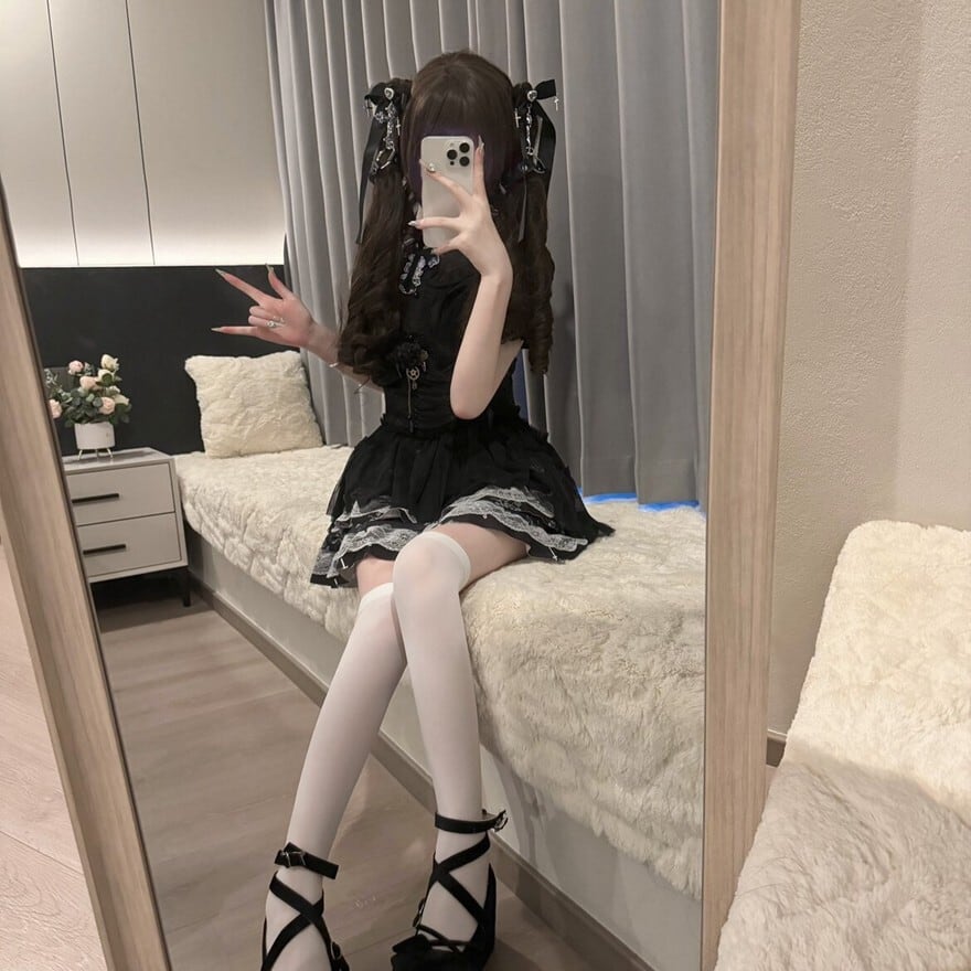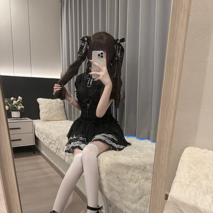 ミニ丈のゴスロリは可愛すぎて見えそう、黒一色だと重たくなりそう。そんな迷いを感じる方にも取り入れやすいデザインです。胸元から裾まで装飾の重なりがしっかりあるため、黒基調でも単調になりにくく、上着を合わせれば上半身にも印象が集まり、撮影やおでかけでもバランスよくまとまります。