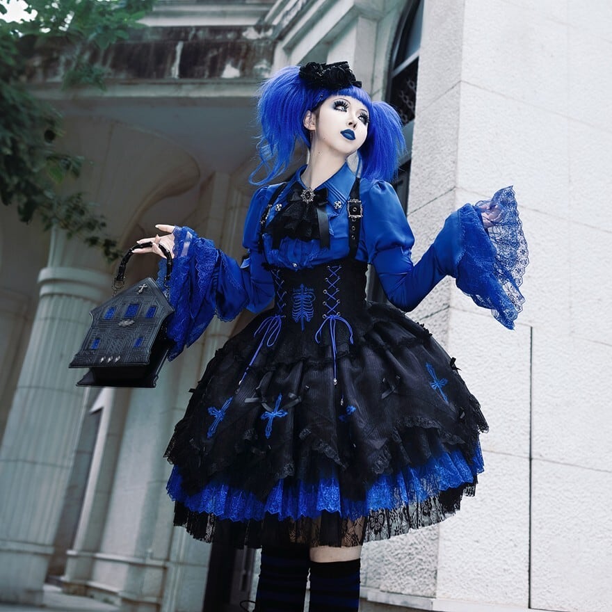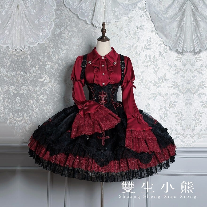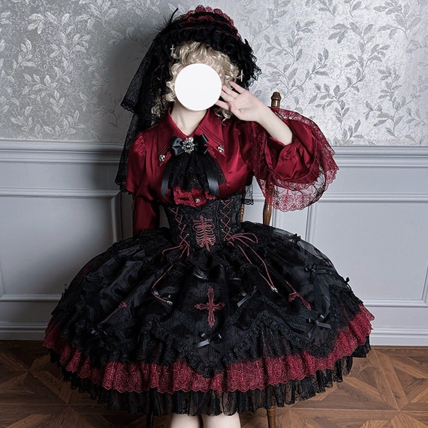 十字架モチーフを散りばめたジャンパースカートと姫袖ブラウスの組み合わせが特徴で、双子コーデやコンカフェ衣装で存在感のある世界観を纏いたい方に最適です。カラーごとに印象が変わり、黒を基調にした耽美な空気をしっかり引き立ててくれます。