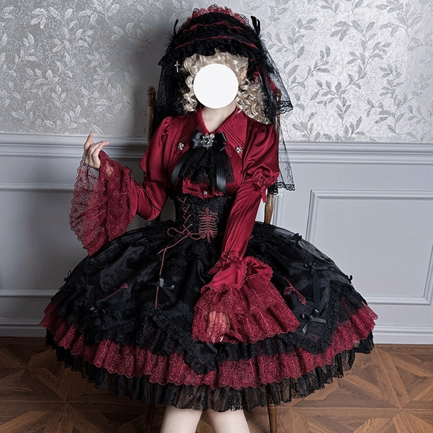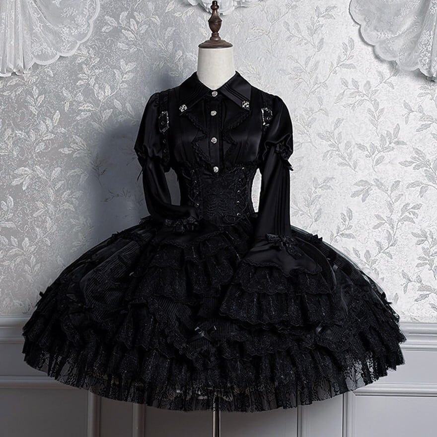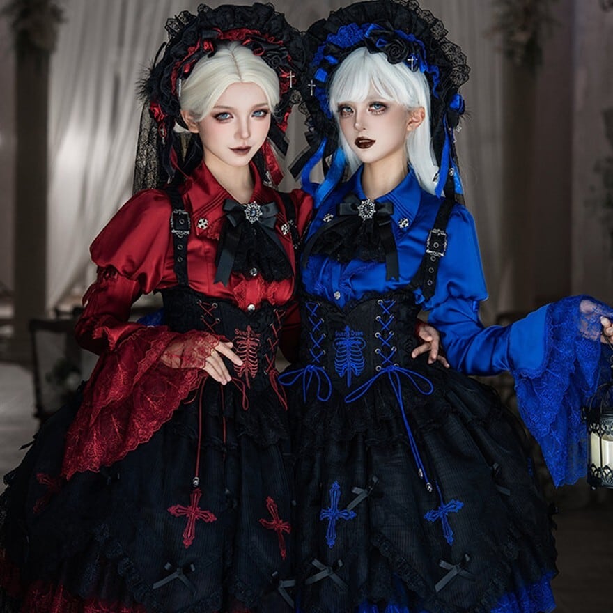 ゴスロリを選びたいけれど、ただ甘いだけでは物足りない。コンカフェ衣装やイベント用に、並んだときにも統一感が出る一着を探している。そんな方にぴったりのセットです。ジャンパースカートの重厚感と姫袖ブラウスの華やかさがしっかり分かれているため、単調になりにくく、双子コーデでも色違いで世界観を揃えやすいのが魅力です。