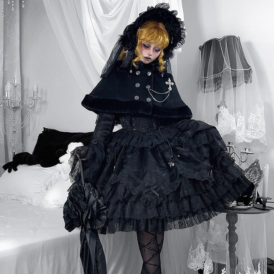 深い闇の中に、十字架の意匠と幾重ものレースが静かに浮かび上がるような一着です。姫袖の揺らぎとふくらみのあるシルエットが、退廃的でありながらも格調ある物語の空気を完成させます。