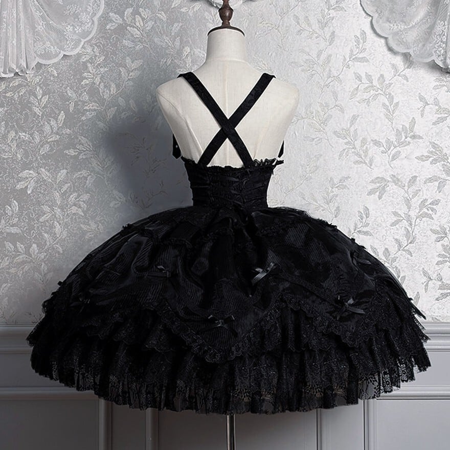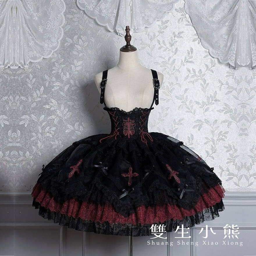 ・モチーフ:スカートや身頃に十字架の意匠をあしらい、ダークで象徴的なアクセントを添えています。