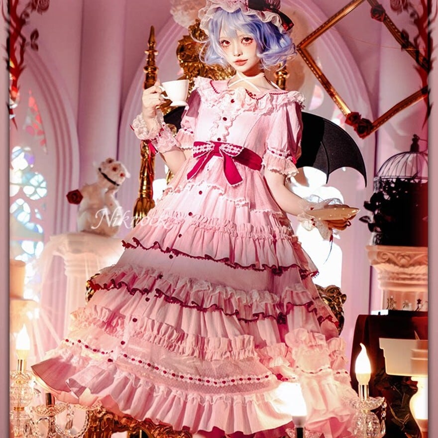 淡いさくら色の中に、赤いリボンが物語の余韻のように揺れる一着です。幾重にも重なるフリルとレースが、儚さの中に気品を宿し、非日常の空気をやわらかく引き寄せてくれます。