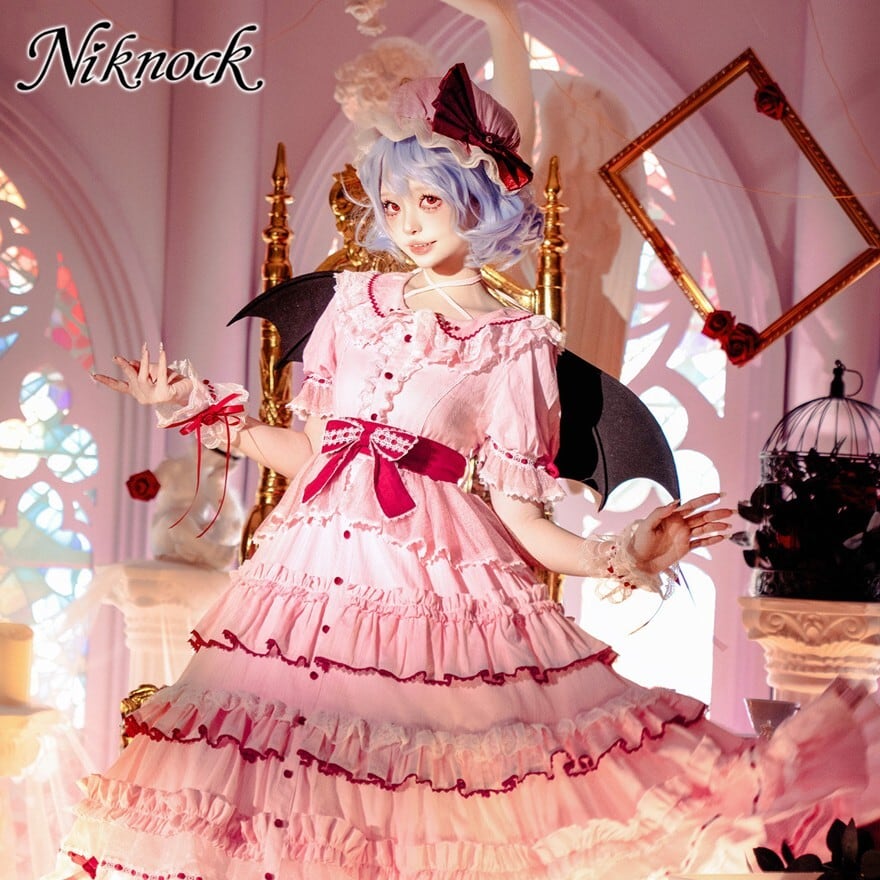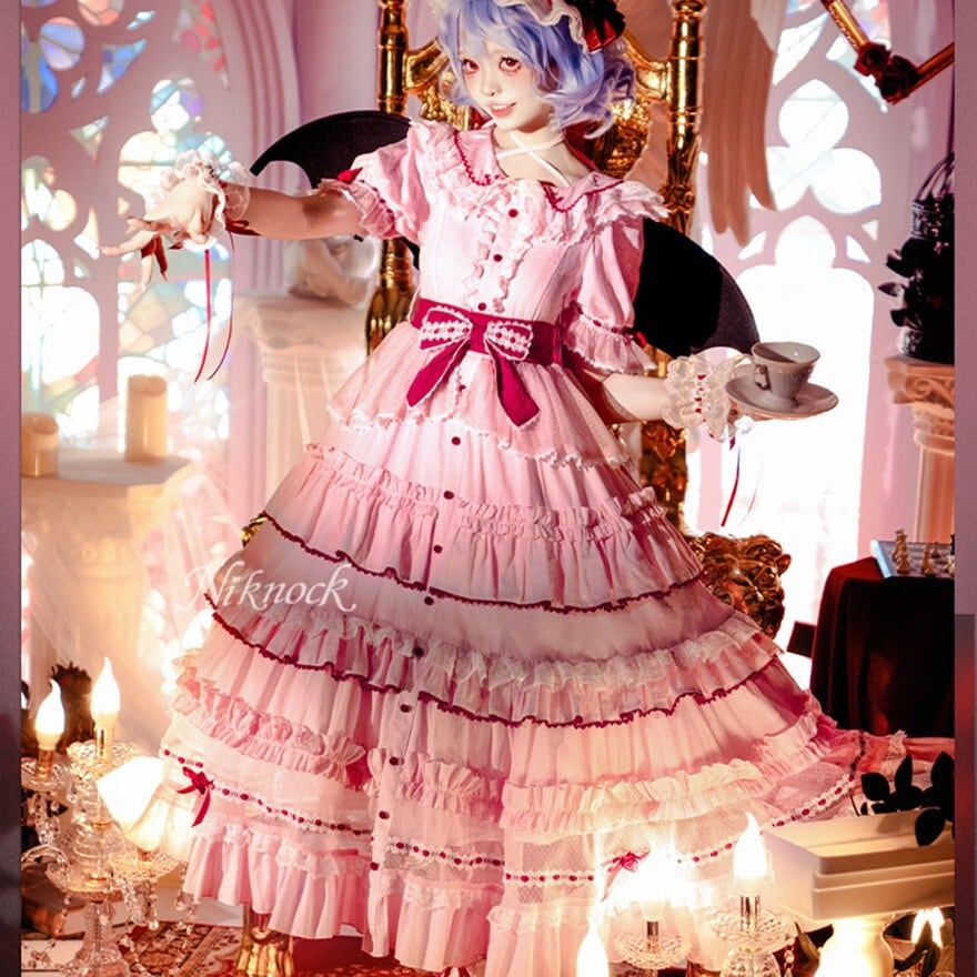 さくらピンクを基調に白レースと赤リボンを重ねたフリルたっぷりのロングシルエットが特徴で、撮影会やイベントで甘く幻想的な世界観を纏いたい方に最適です。帽子、カフス、ベルトまで揃っているため、統一感のある華やかなコーデが完成します。