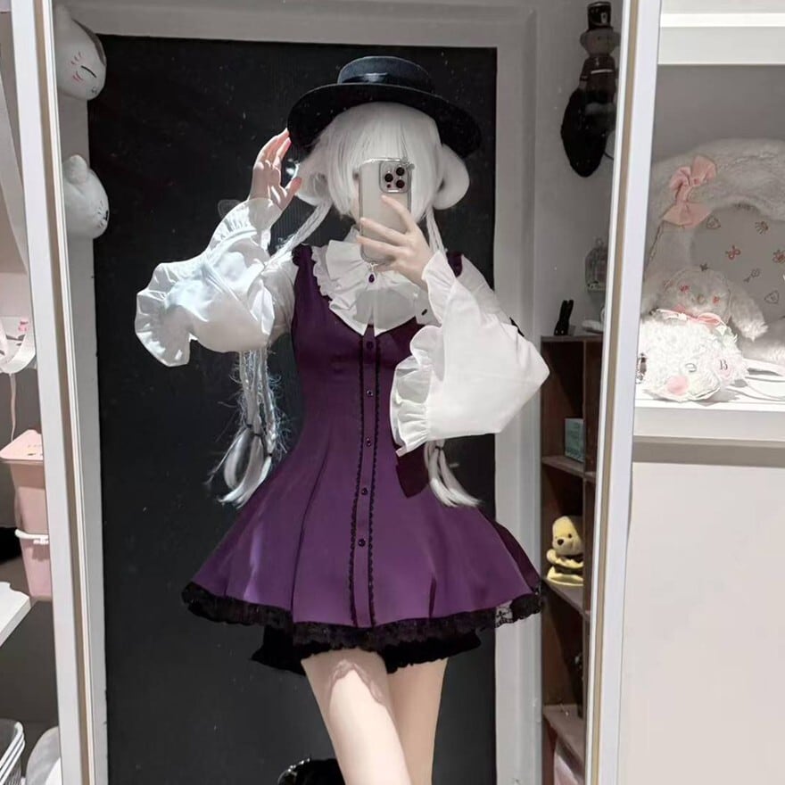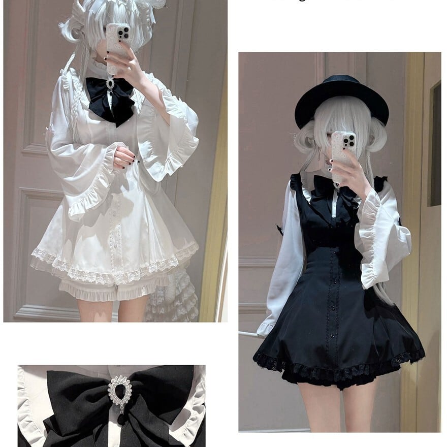 姫袖ブラウスとミニ丈ジャンスカを軸にした3点構成が特徴で、ゴシック寄りの地雷系コーデを上品にまとめたい方に最適です。大きめリボンとレース使いが顔まわりを華やかに見せ、4カラーそれぞれで異なる世界観を楽しめます。
