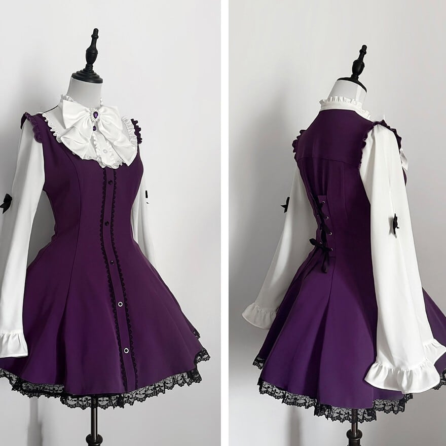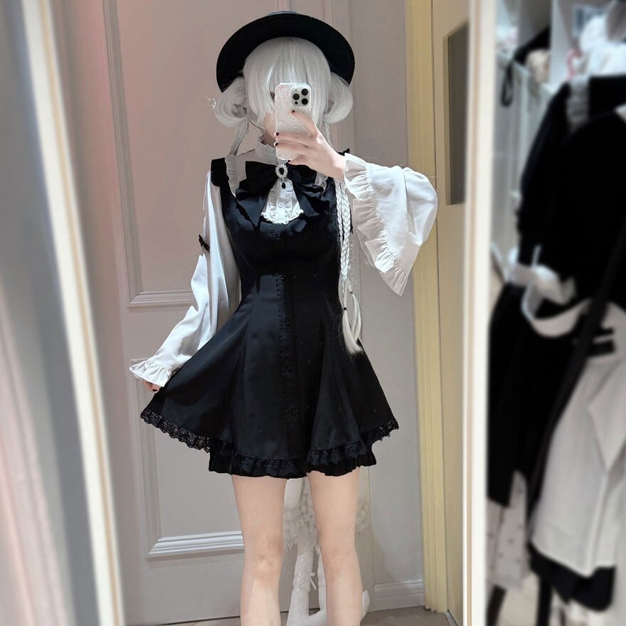 地雷系を着たいけれど、甘すぎる印象には寄せたくない。そんな方にも合わせやすいセットです。襟元の大ぶりリボンや姫袖の華やかさはしっかりありながら、ジャンスカのすっきりしたシルエットが全体を引き締めるため、可憐さとゴシック感のバランスが取りやすくなっています。カラーごとに雰囲気が変わるので、自分らしい一着を選びやすいのも魅力です。