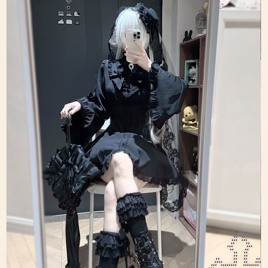 ・テーマのあるおでかけに。ヘッドドレスや厚底シューズを合わせることで、完成度の高い地雷系ゴシックコーデにまとまります。