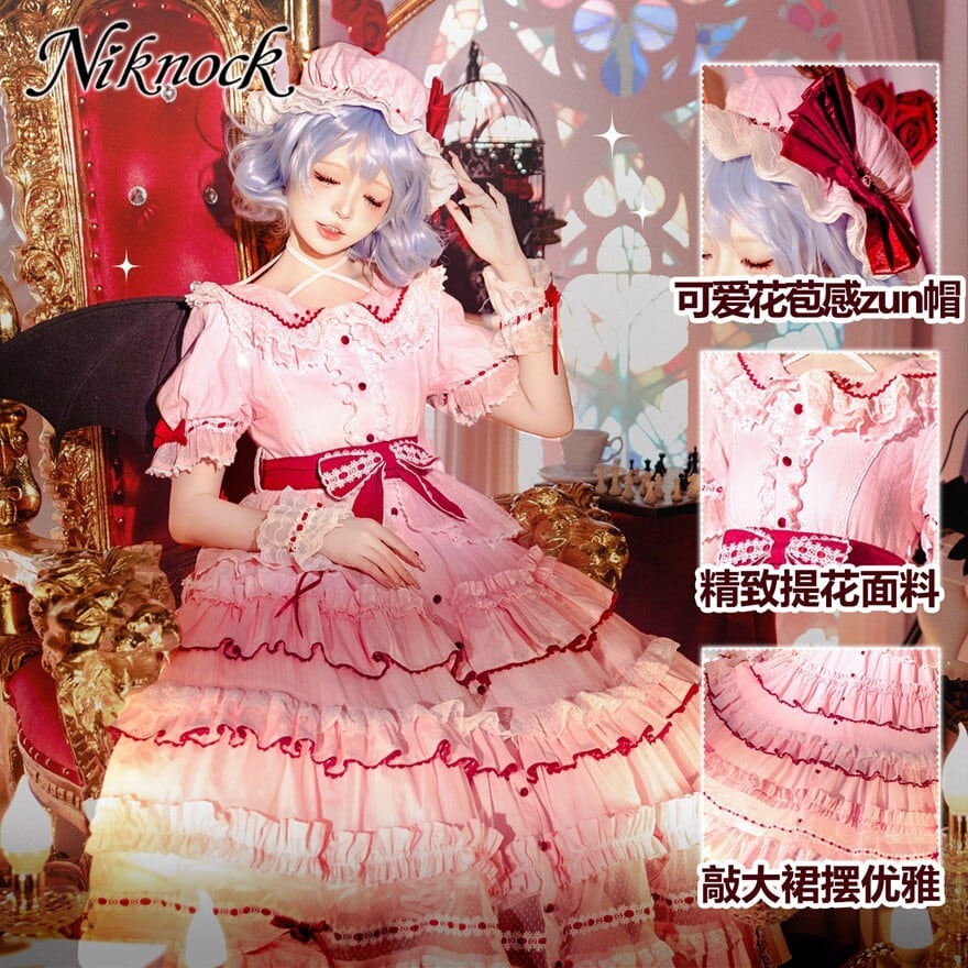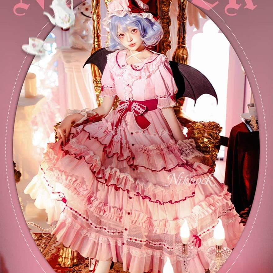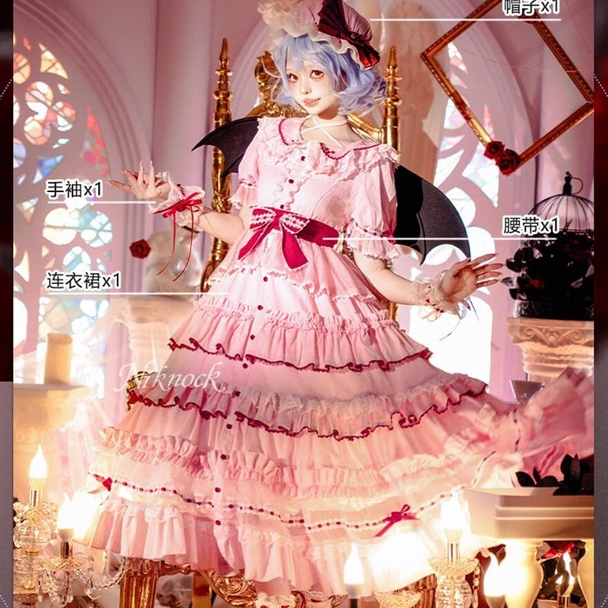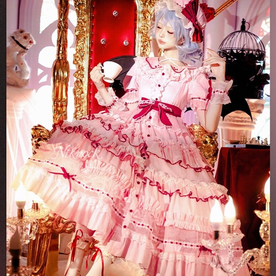 さくらピンクを基調に白レースと赤リボンを重ねたフリルたっぷりのロングシルエットが特徴で、撮影会やイベントで甘く幻想的な世界観を纏いたい方に最適です。帽子、カフス、ベルトまで揃っているため、統一感のある華やかなコーデが完成します。